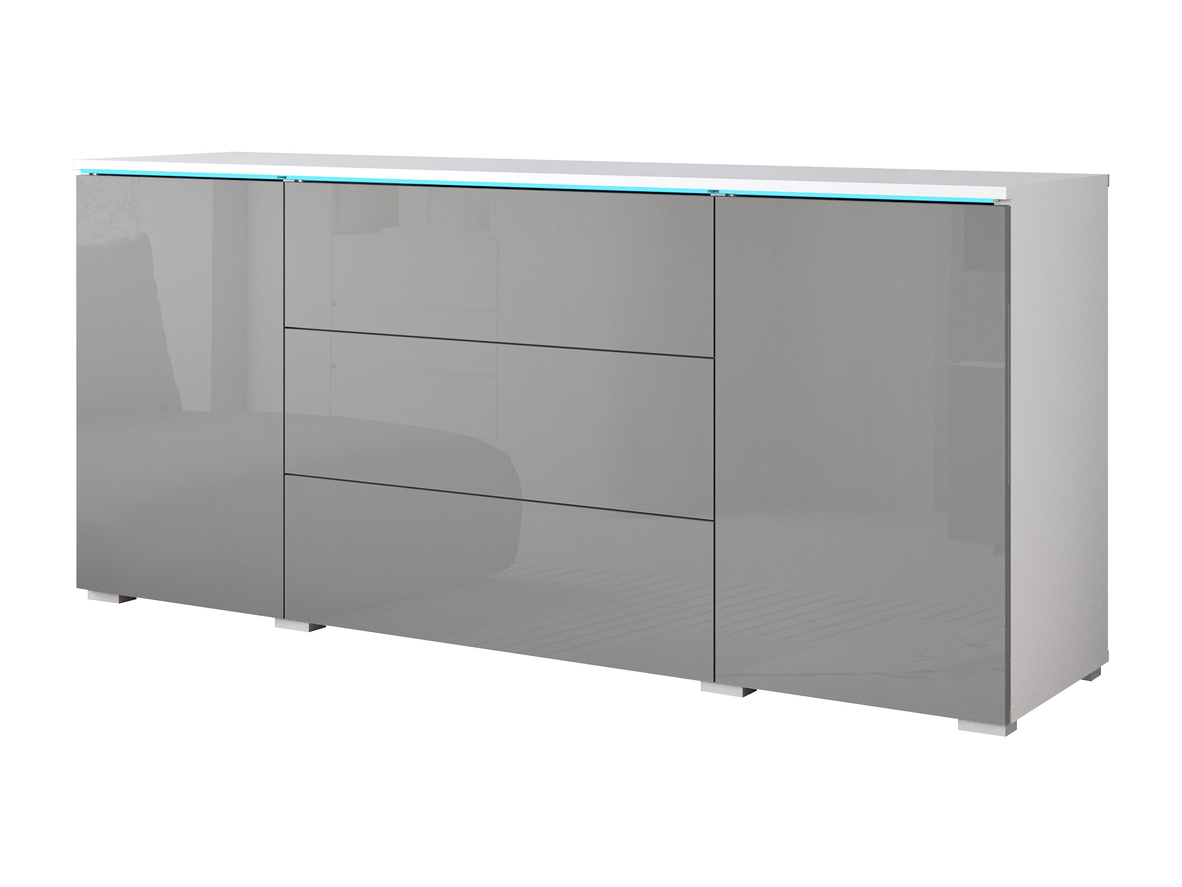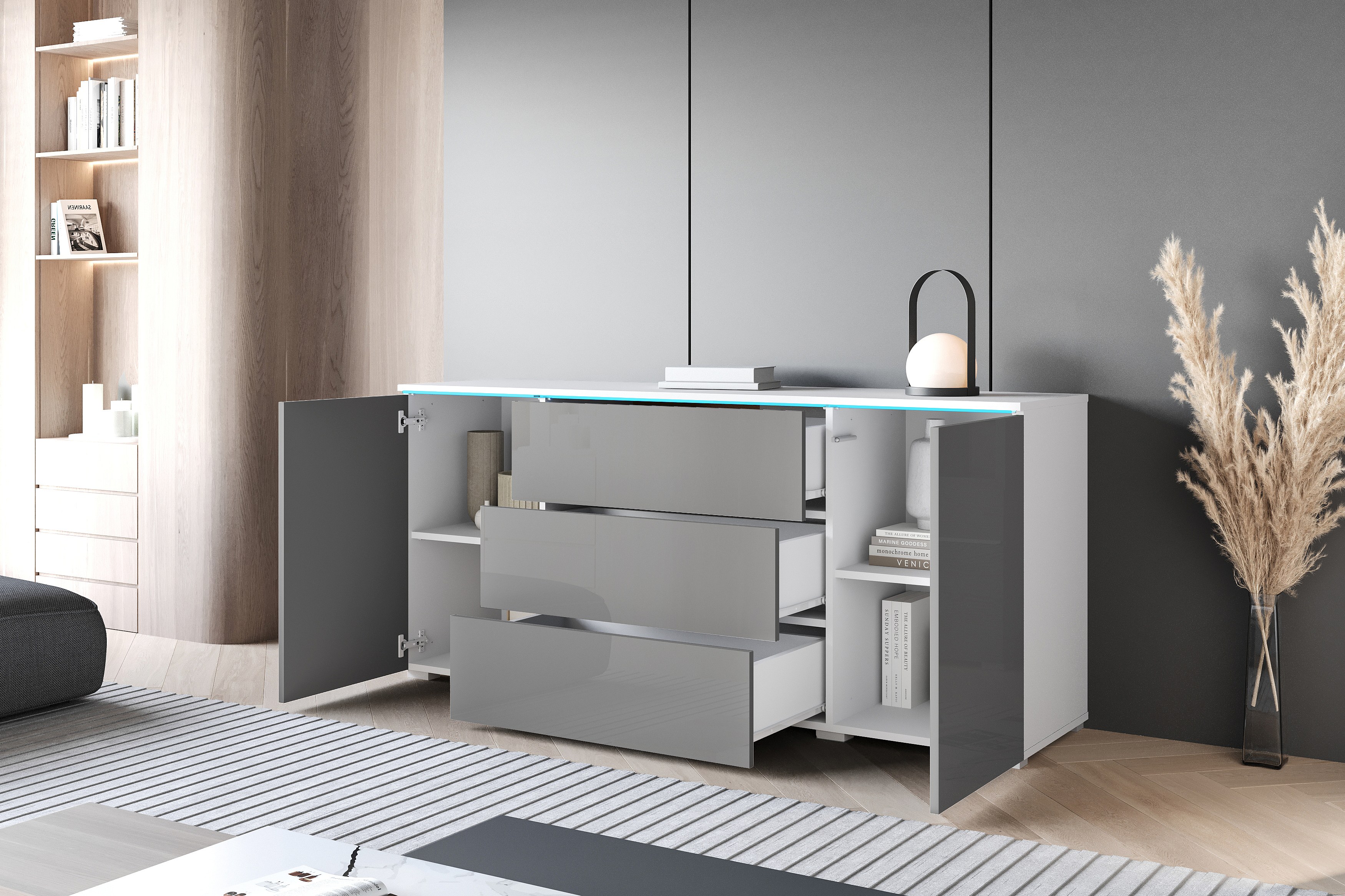 Moderne dressoir 150 cm met LED voor de woonkamer – corpus wit mat, fronten grijs hoogglans, 3 lades en 2 deuren