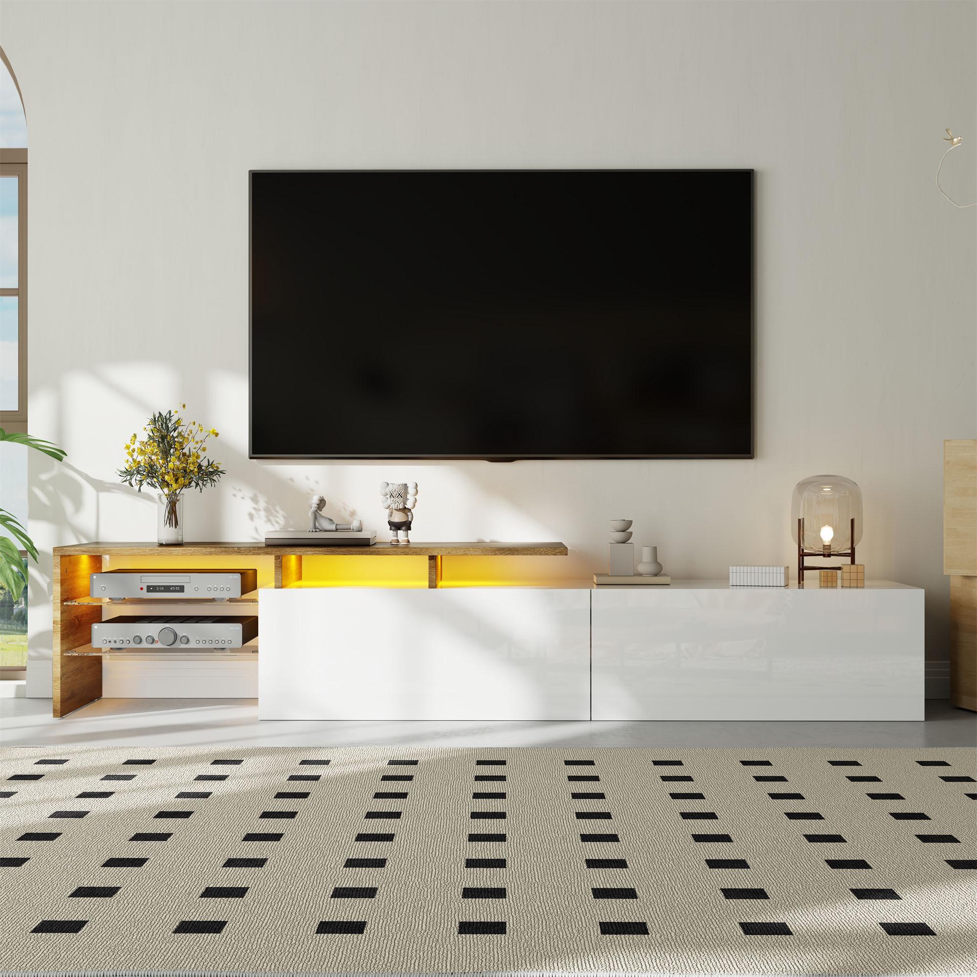 TV-meubel, stijlvol en elegant, hoogglans wit/houtlook, glazen planken en ledverlichting. Praktische opbergruimte.