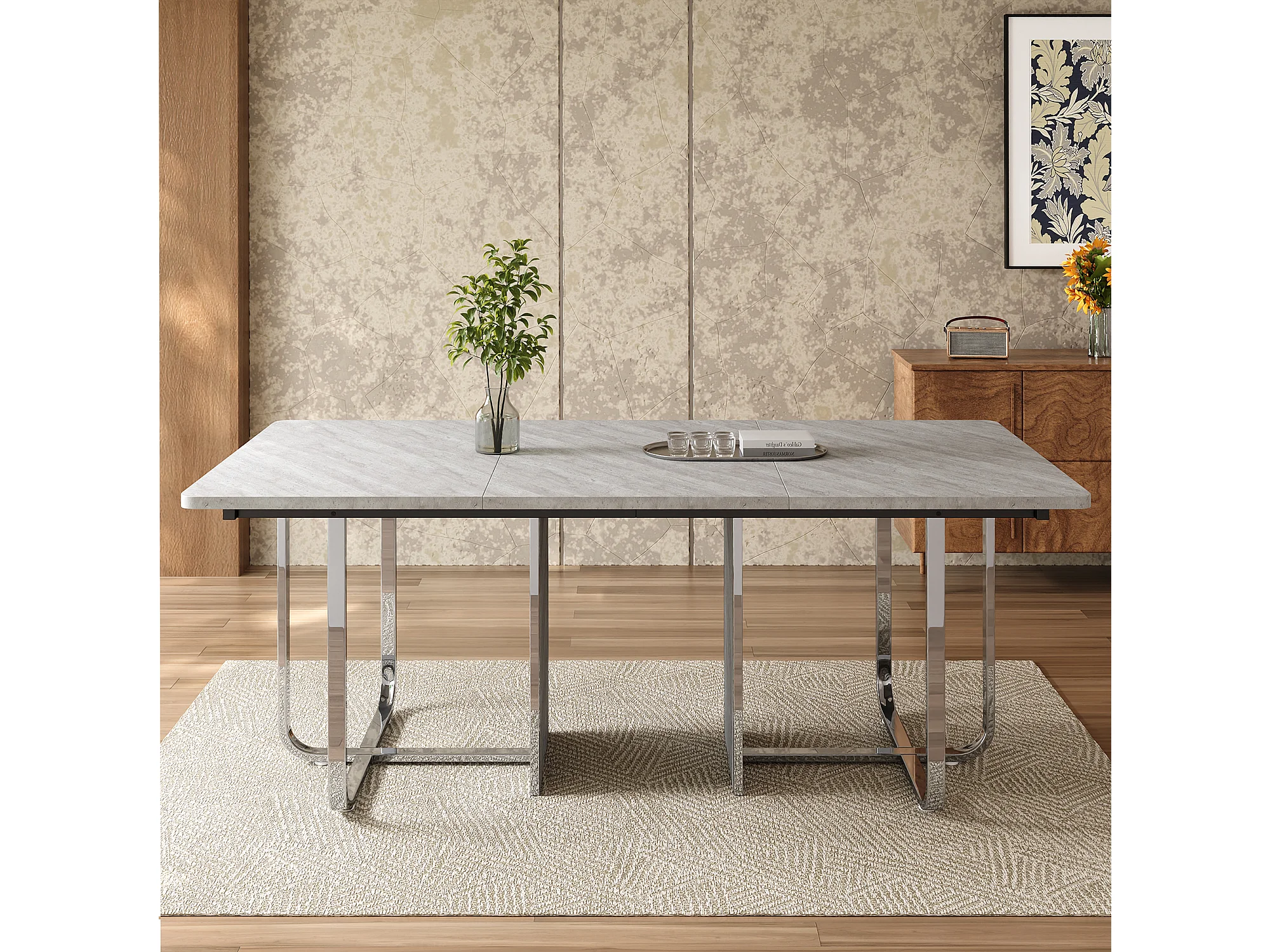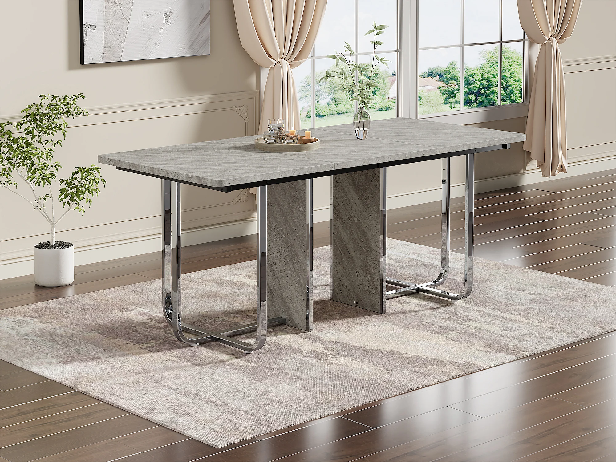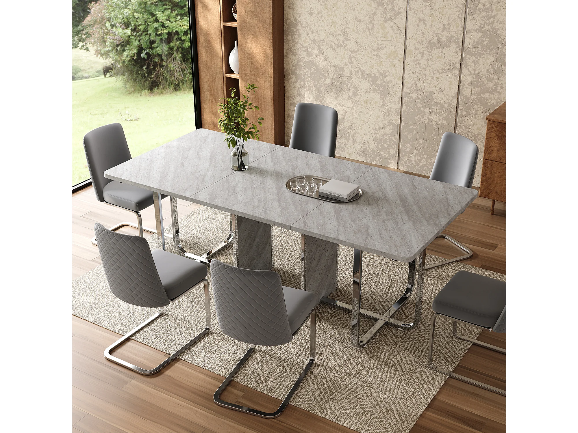 Rechthoekige eettafel met grijs blad en zilverkleurig metalen frame – Voor 6 tot 8 personen