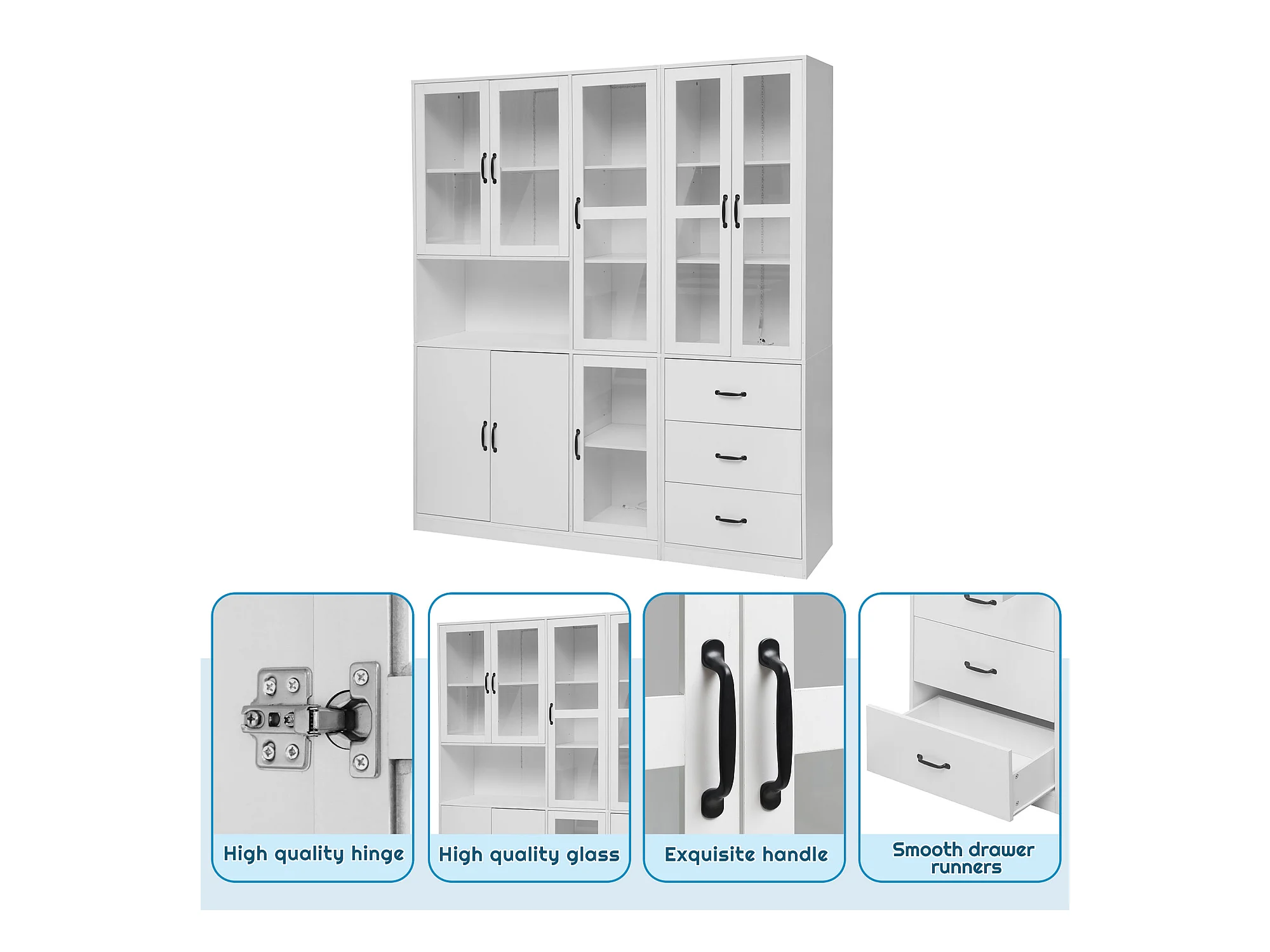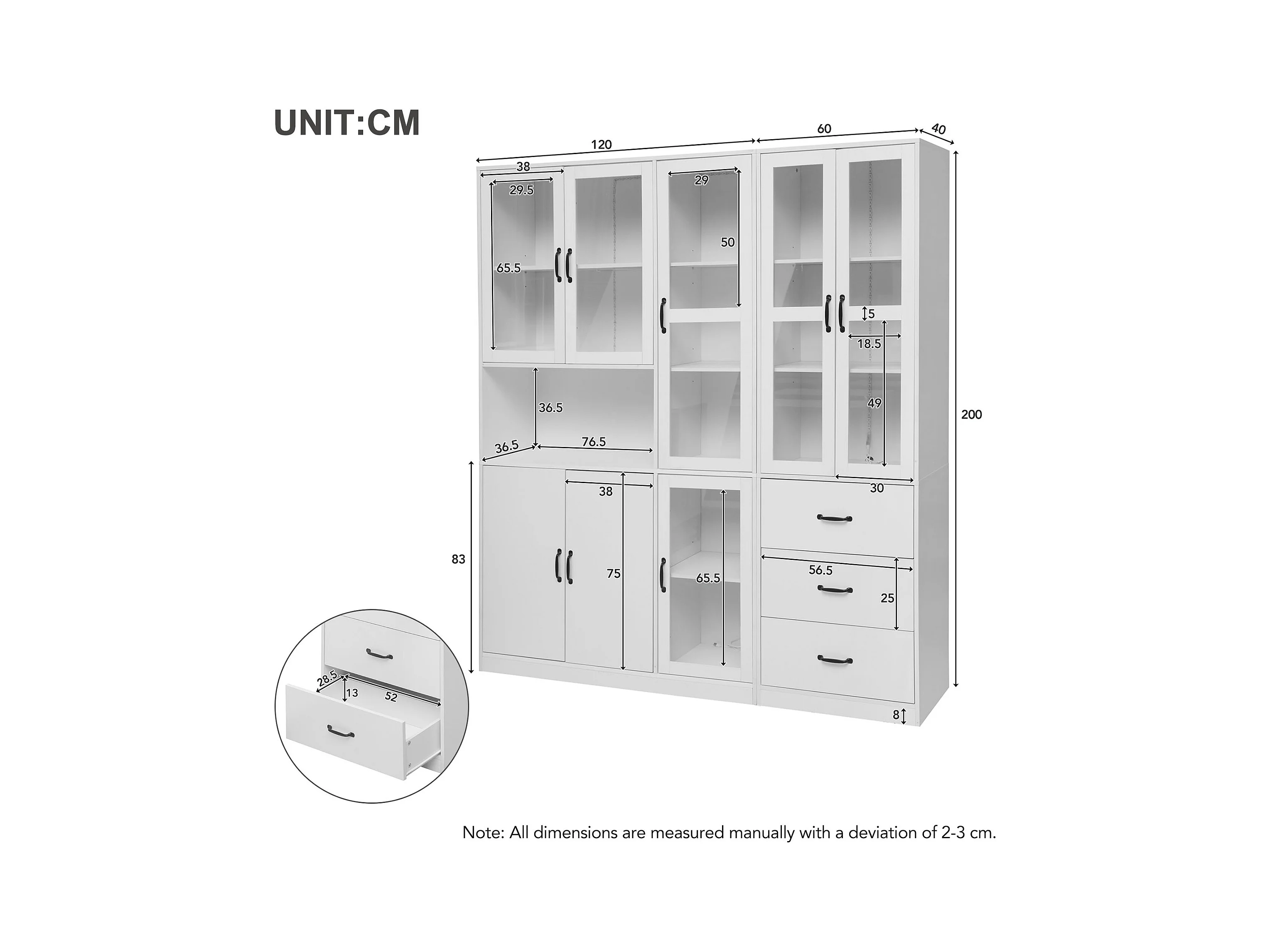 Vitrinekast 120x36x200 cm met LED - 6 glazen deuren en 3 laden - Wit