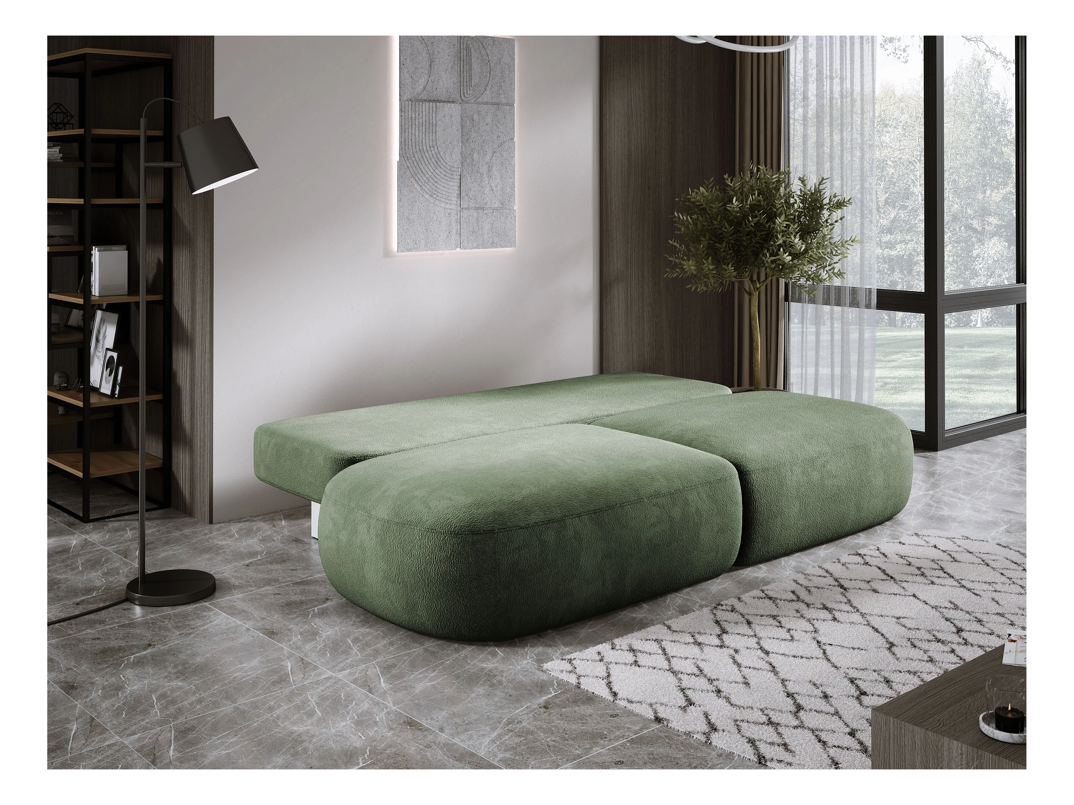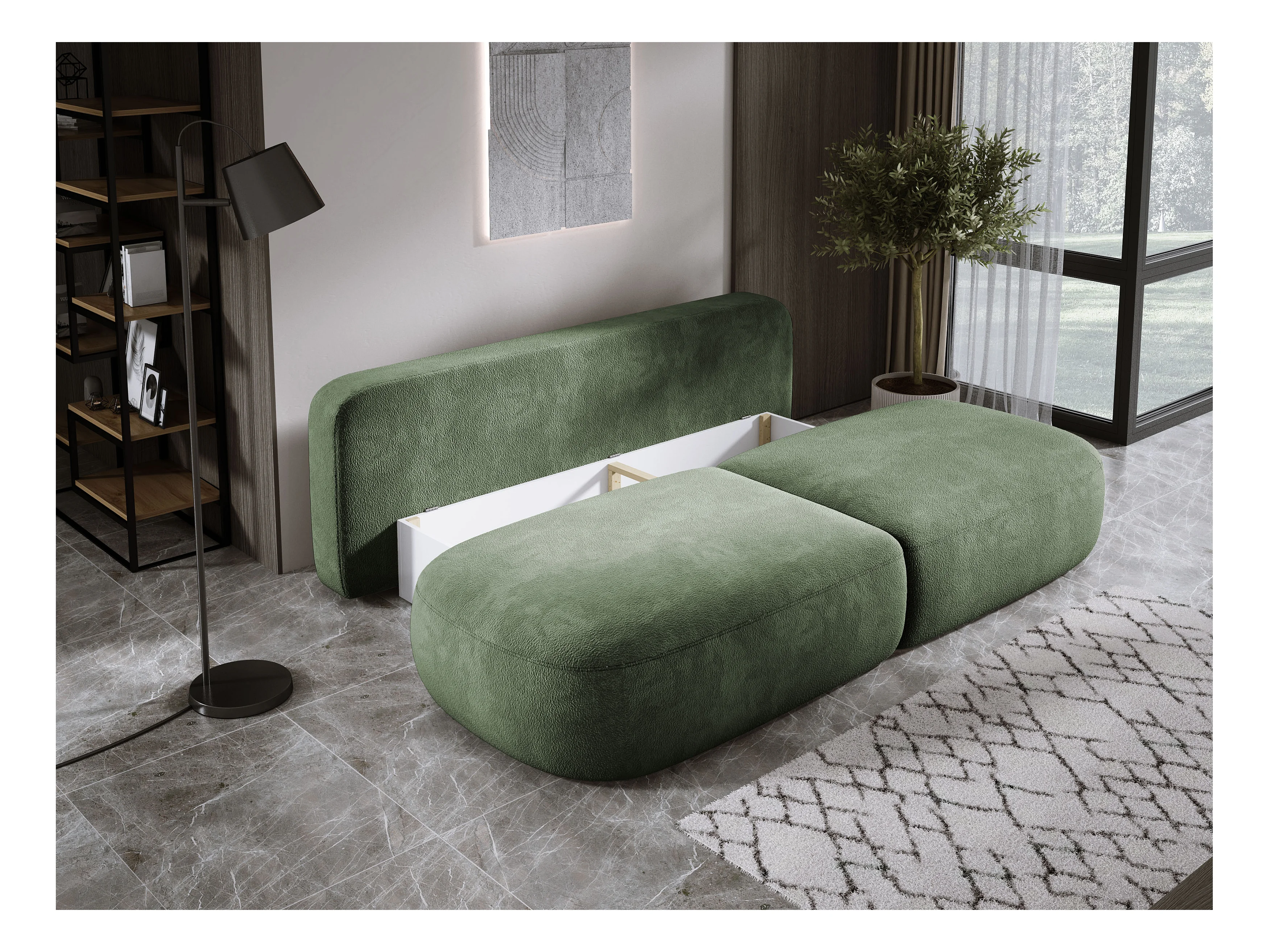 BOULI 4-zitsbank met Raven-stof, slaapfunctie 130x210cm, lichtbestendig, vrijstaand, opbergruimte, 264x162x82cm, rechter zeegroen