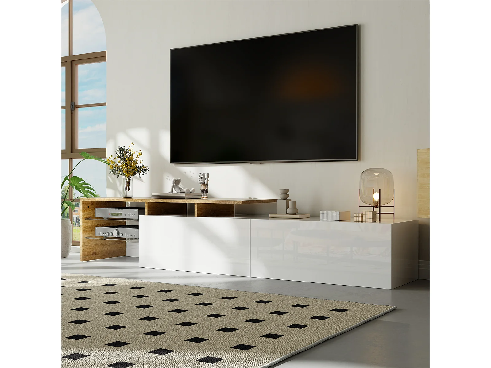 Moderne tv-meubel met ledverlichting, ladekast met opbergruimte, glazen planken, 170x33x33,5cm, wit