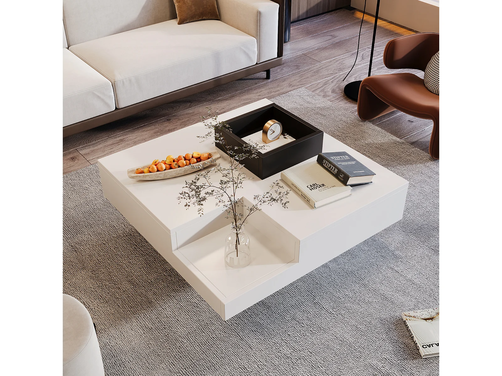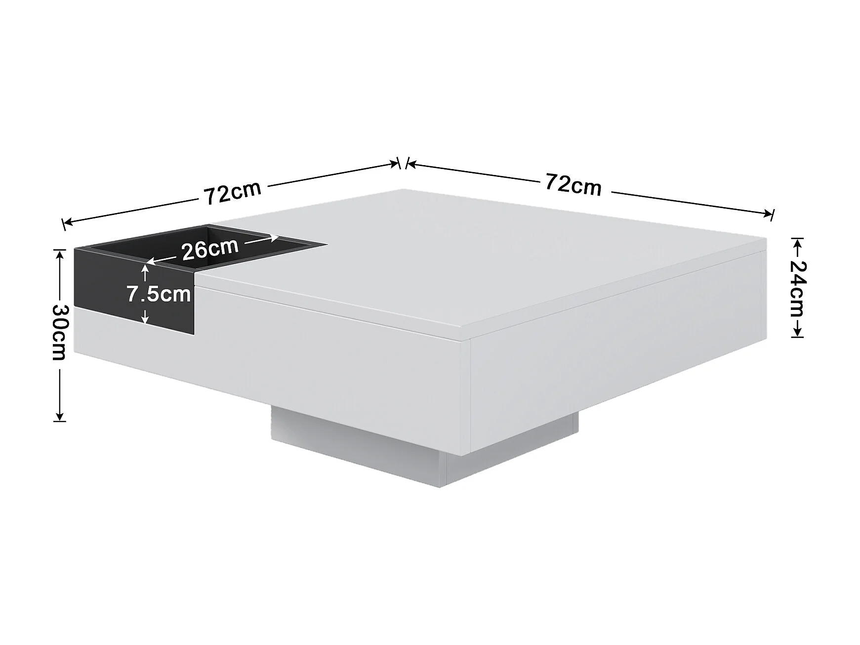 Moderne vierkante salontafel met uitneembare opbergdoos, witte en zwarte bijzettafel
