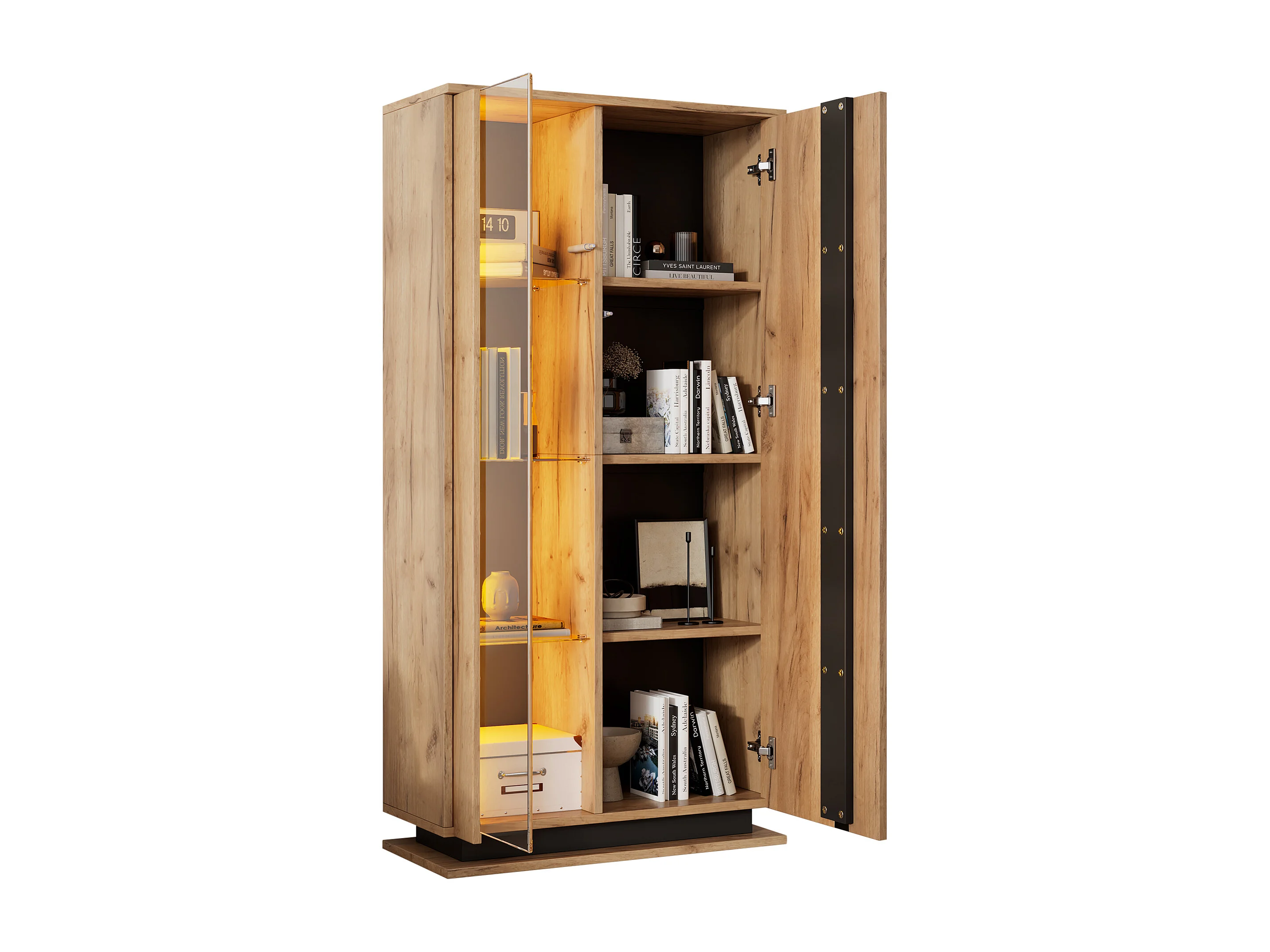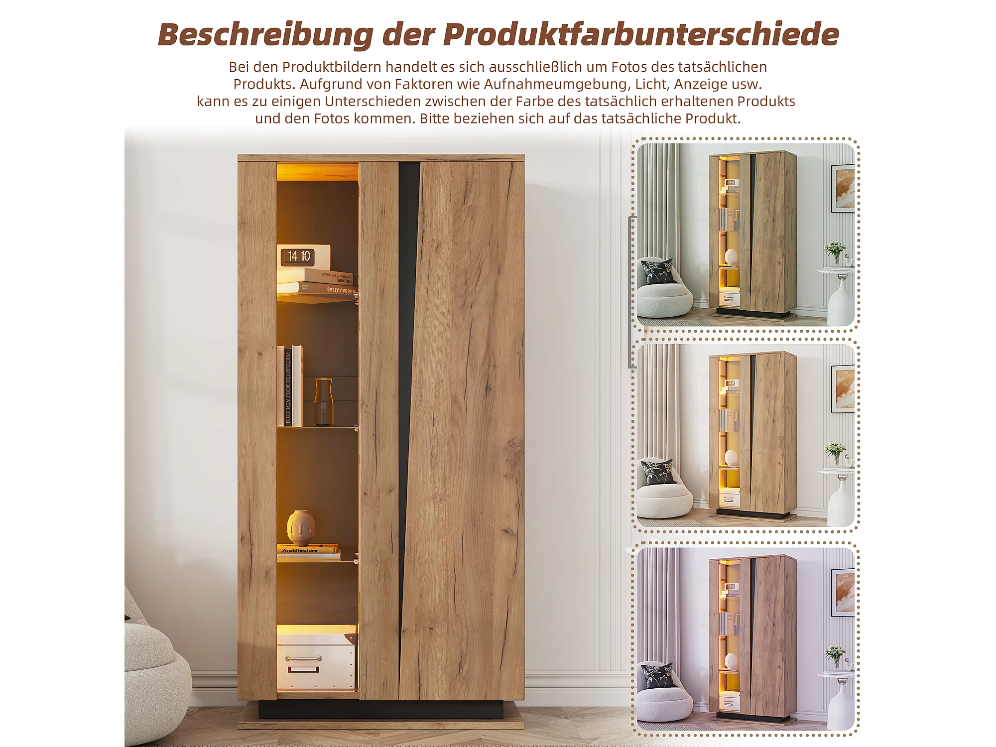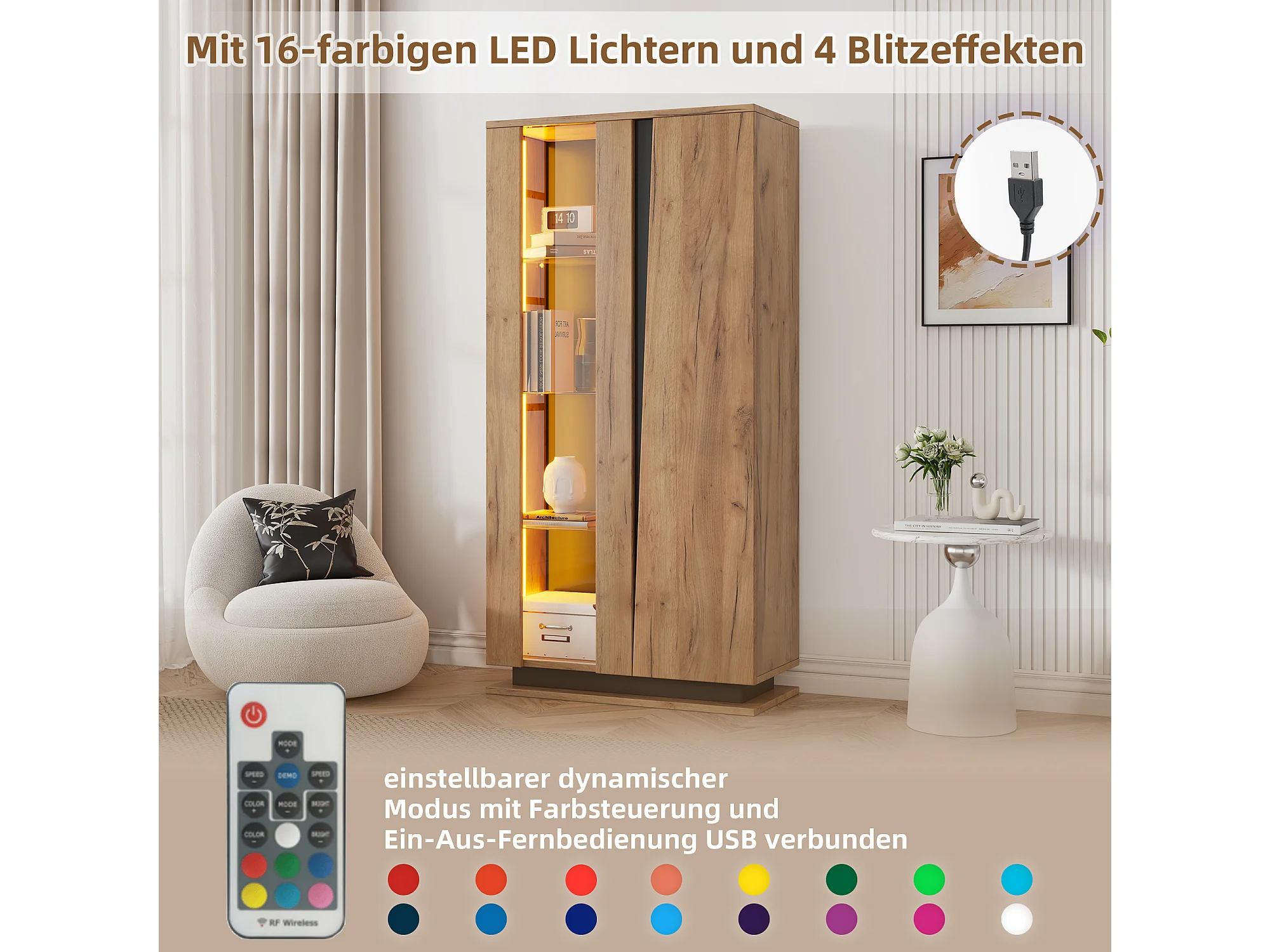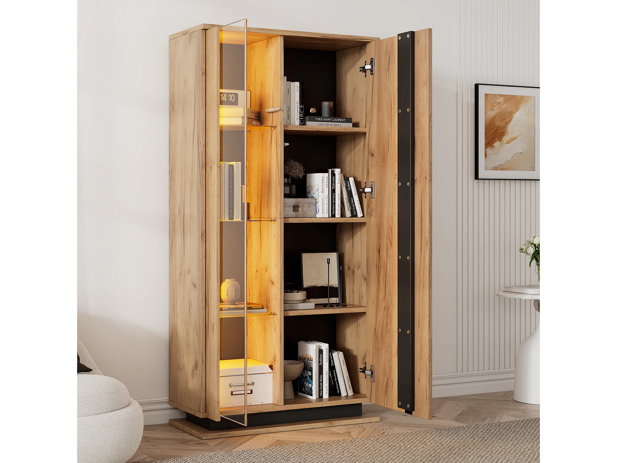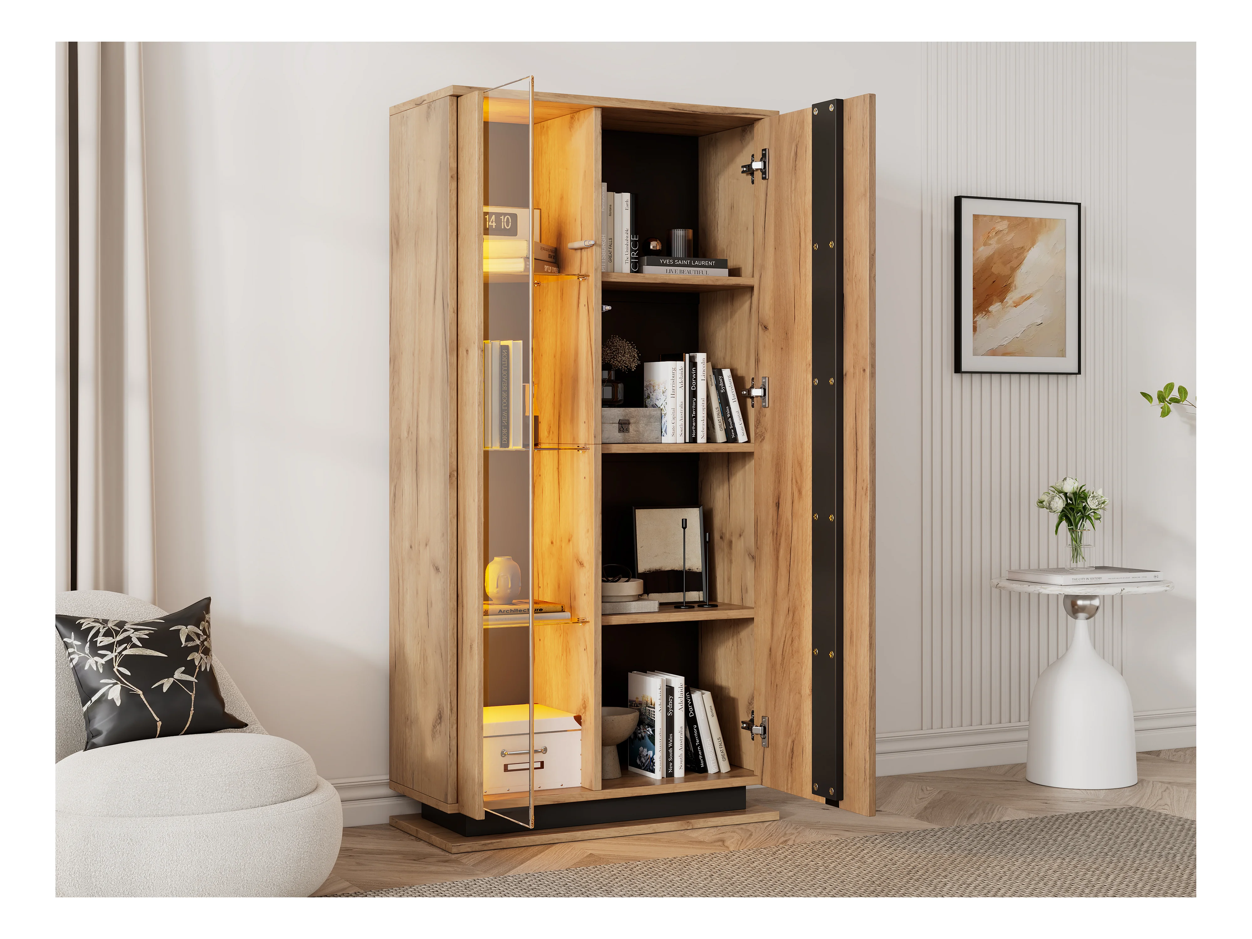 Moderne vitrinekast - 80 x 35 x 160 cm - met 8 planken + 2 deuren + LED's - spaanplaat - naturel