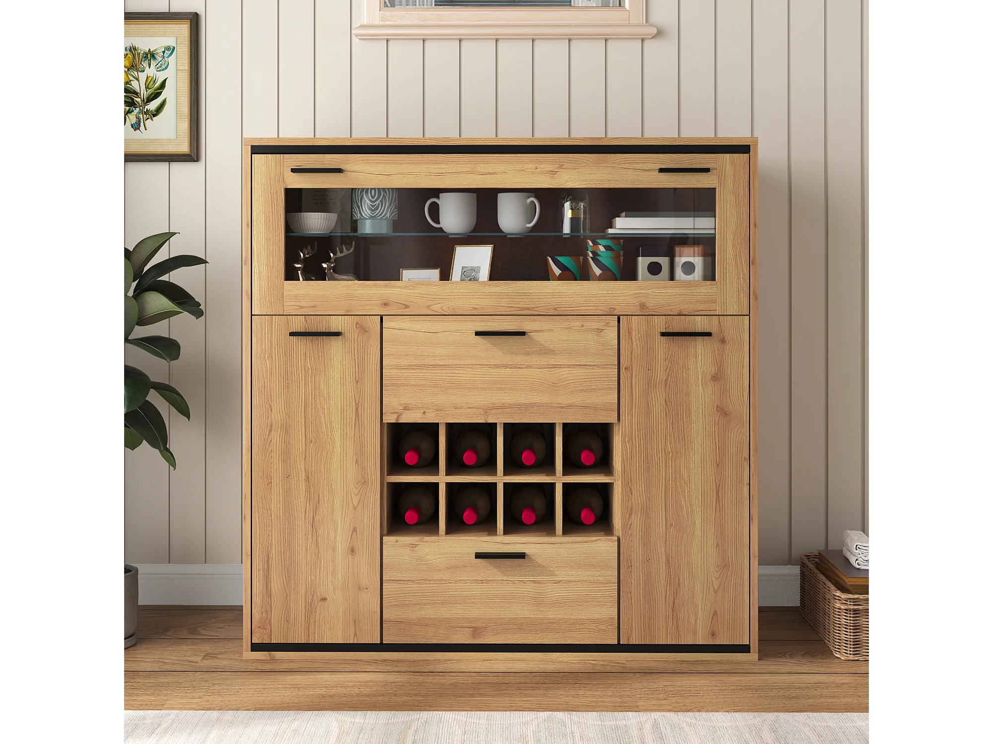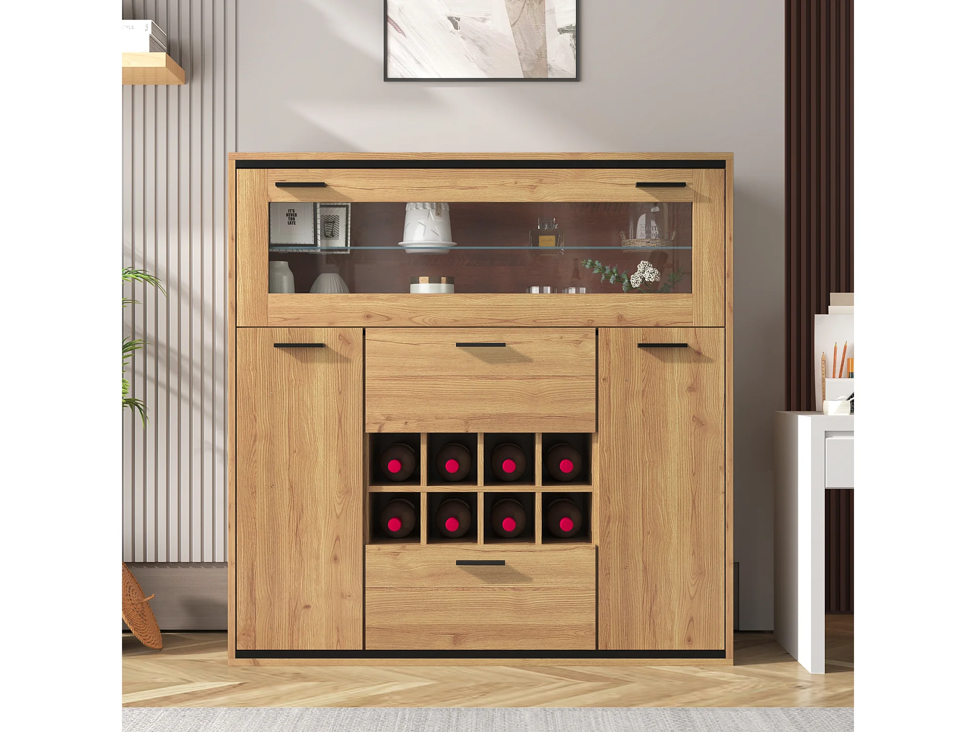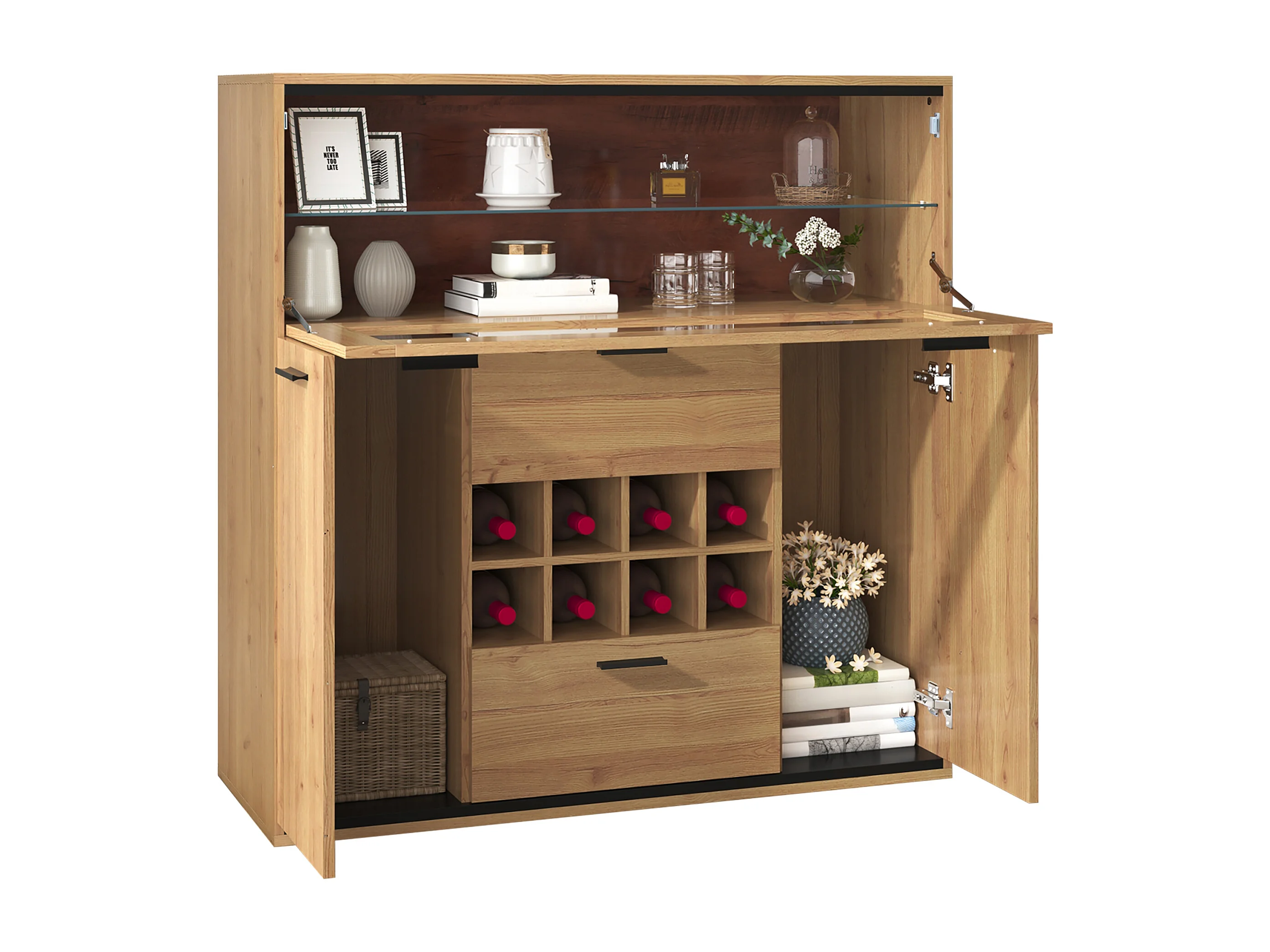 Moderne vitrinekast met ledverlichting, glazen deuren, verstelbare planken, veelzijdige opbergruimte, MDF, hout + zwart (110x38x111 cm)