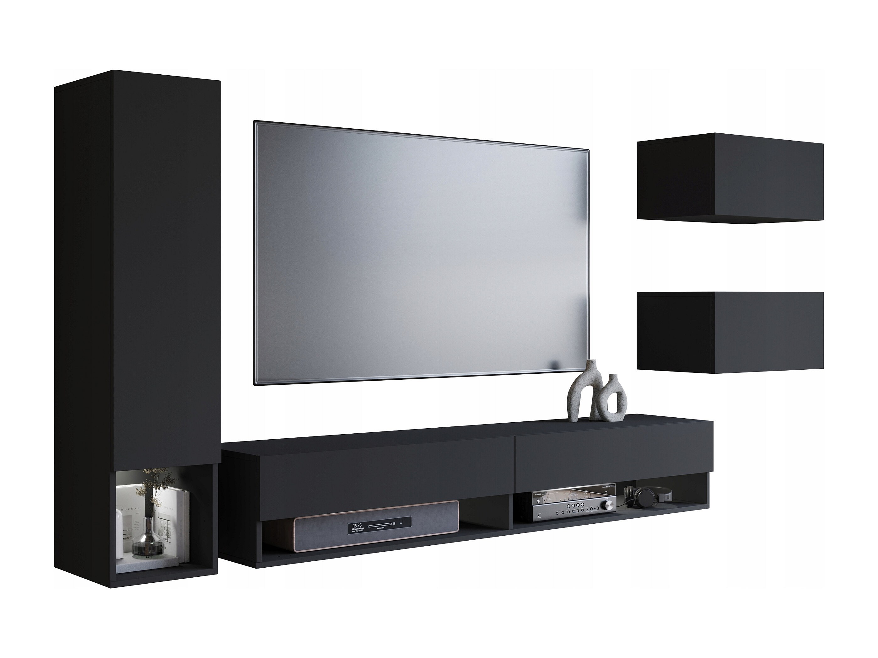 Moderne wandmeubel 4-delig met LED – hangende set TV 180 cm, met kolom en kasten, zwart mat