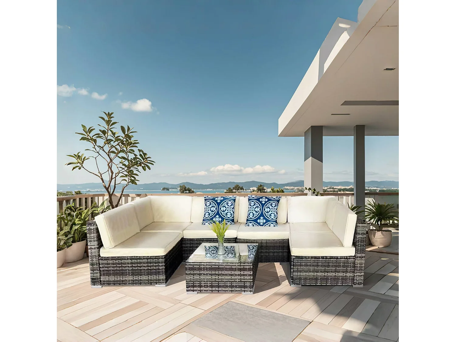 Modulaire 6-persoons tuinset van gevlochten kunststof - Donkergrijs en beige
