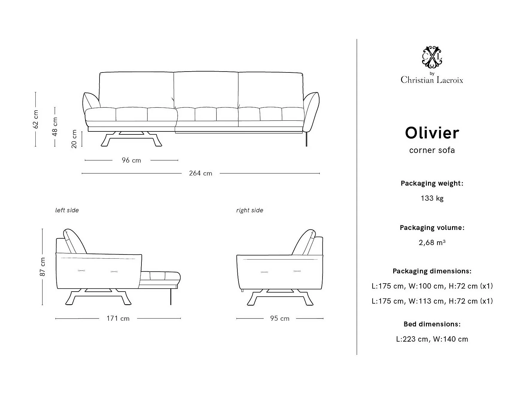 CXL by Christian Lacroix - Modulaire hoekbank links "Olivier" 4 zitplaatsen, Structurele stof, Groente - 264x171x87cm