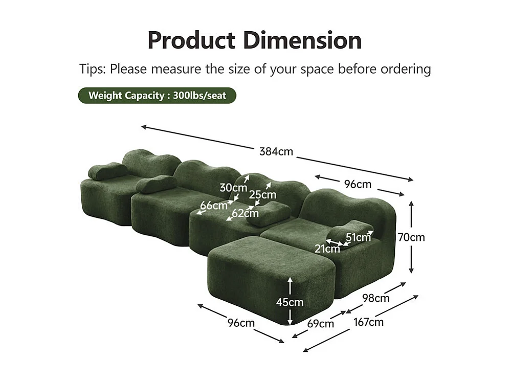 Modulaire hoekbank van fluweel - 4-zits - met poef en armleuningskussen - 384x167x70cm - Groen