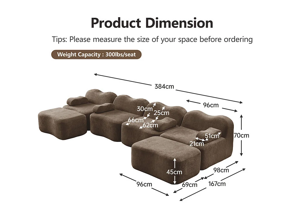Modulaire U-hoekbank - 4-zits - met 2 poefs - Fluweel - 384x167x70cm - Bruin
