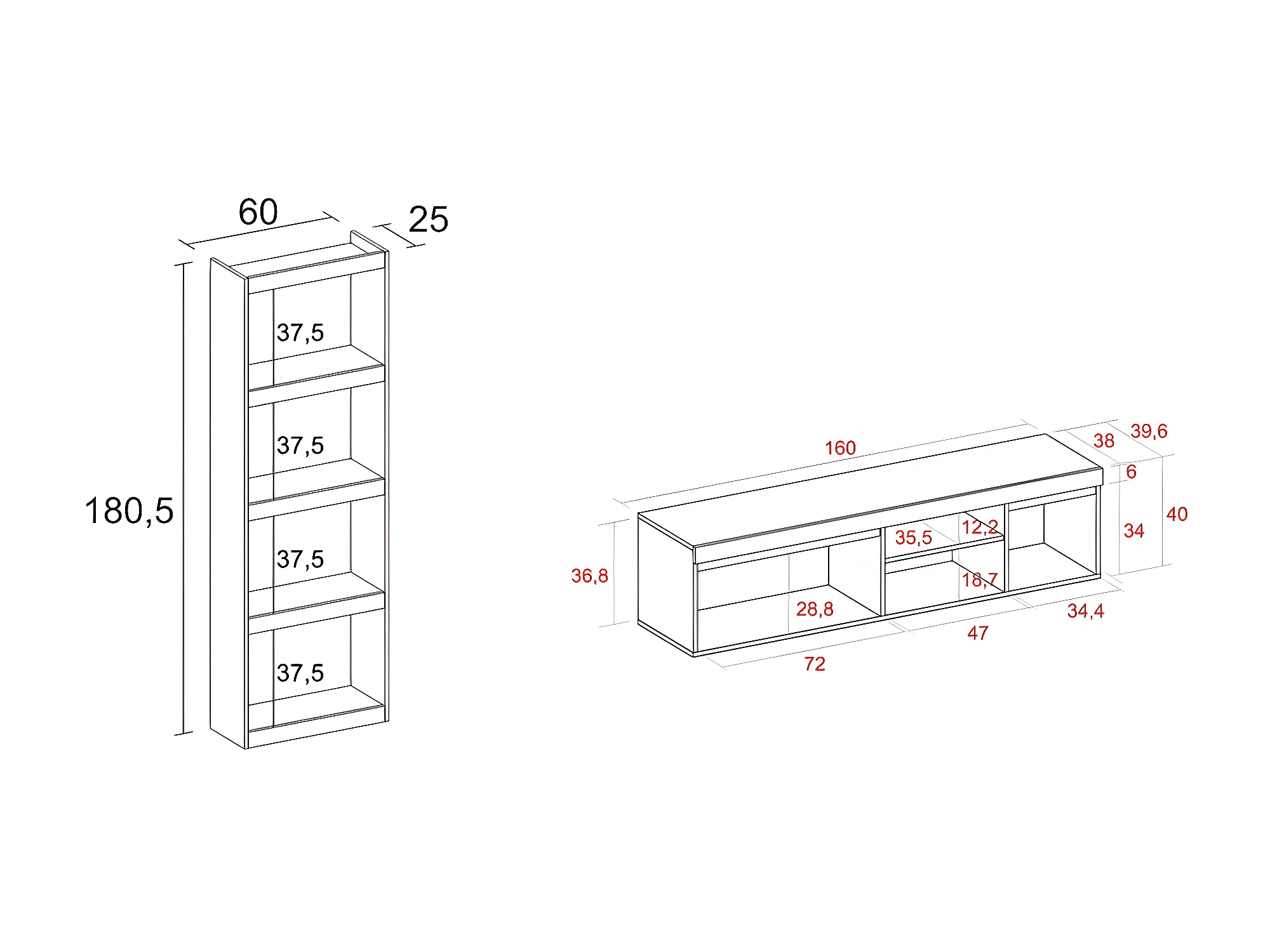 Modulaire woonkamer set, Natuur- en totem -model, 160x40x41cm / 60x25x181cm, Tv -meubels en plank, Eik en zwart, Industriële stijl