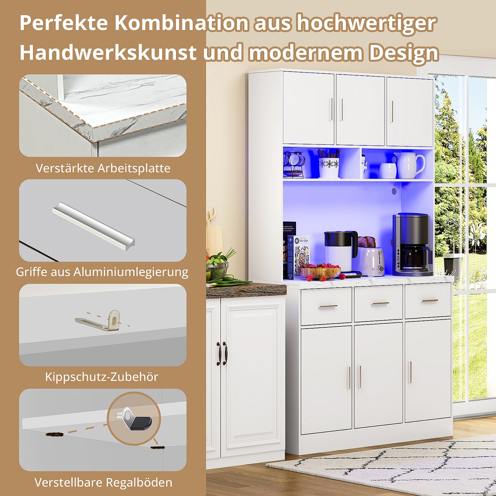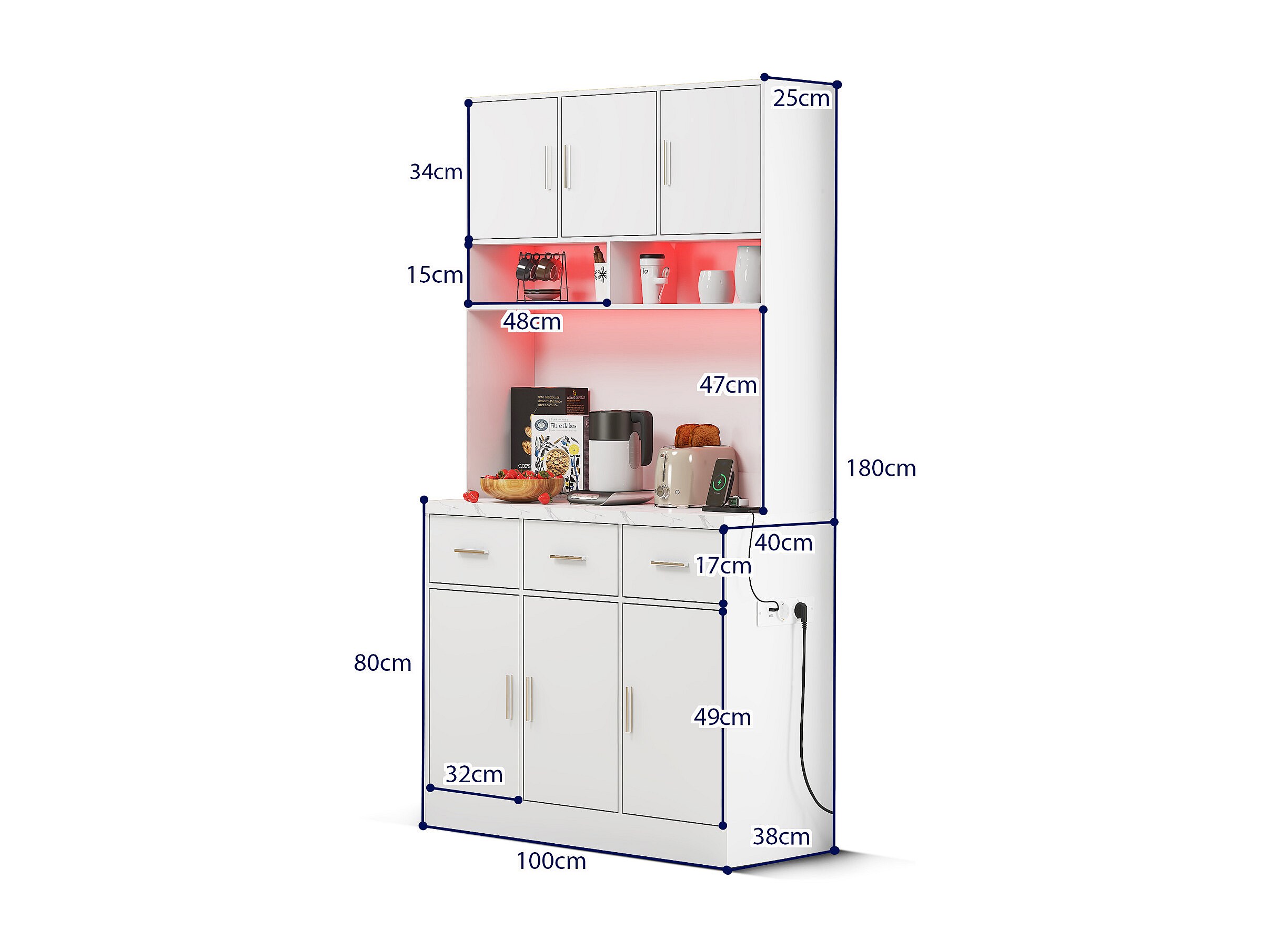 Multifunctioneel dressoir 100×40×180 cm met LED & afstandsbediening, verstelbare planken, laden, kabelbeheer en stopcontacten — ideaal voor keuken/eetkamer