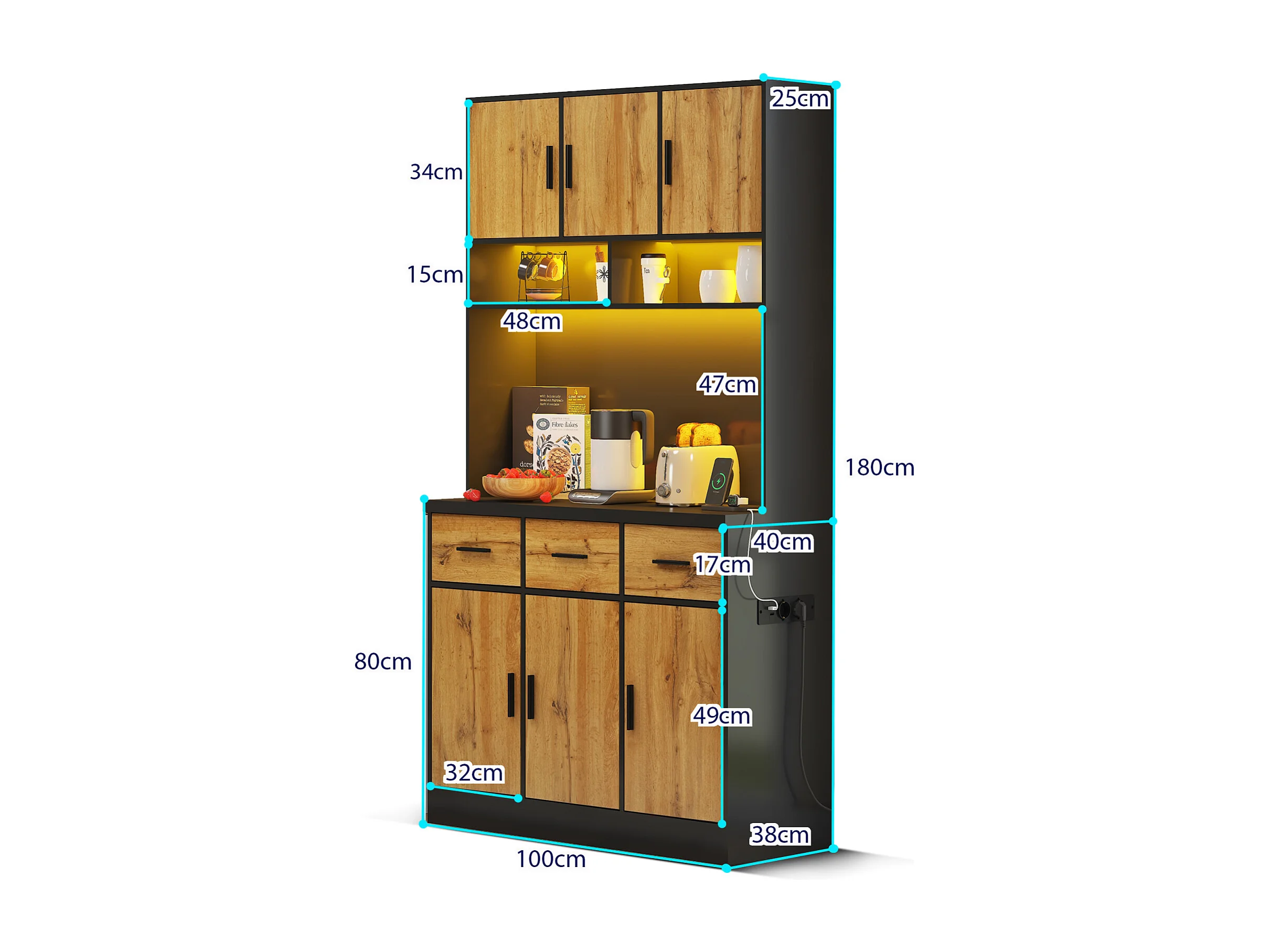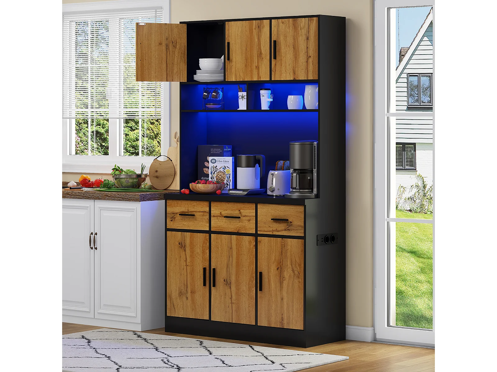 Multifunctioneel dressoir met op afstand bedienbare LED-verlichting, lades, verstelbare planken, stopcontacten – Ideaal voor keuken en eetkamer