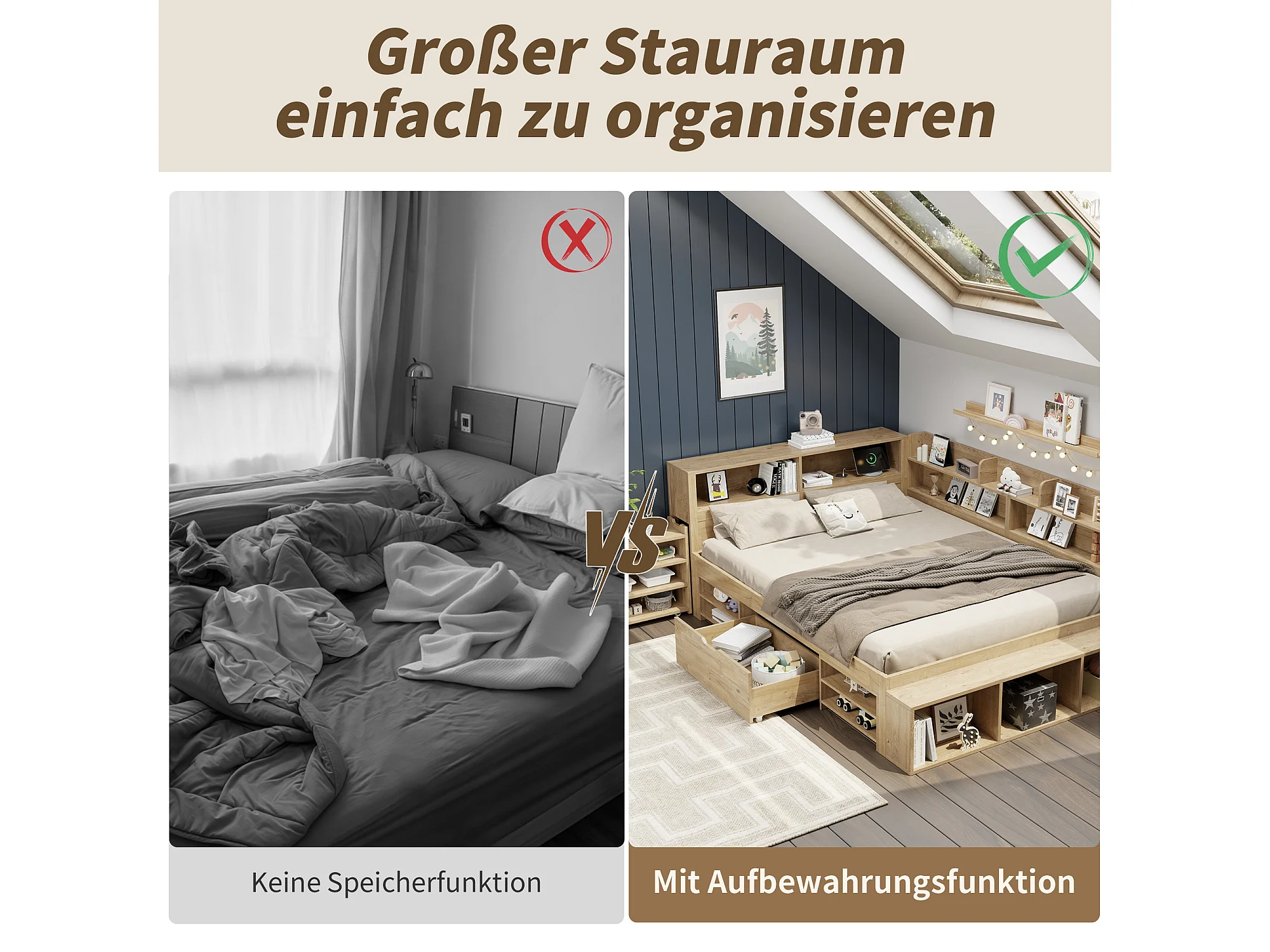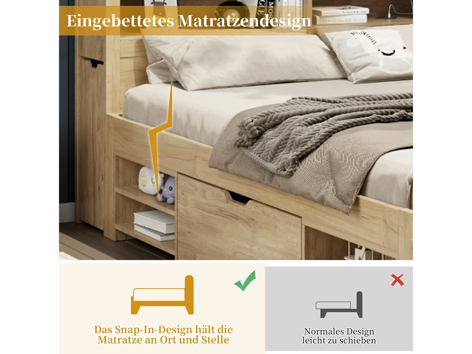 Multifunctioneel kinderbed met opbergruimte, massief hout, 90x200 cm, met lades, planken en draadloze oplader, naturel