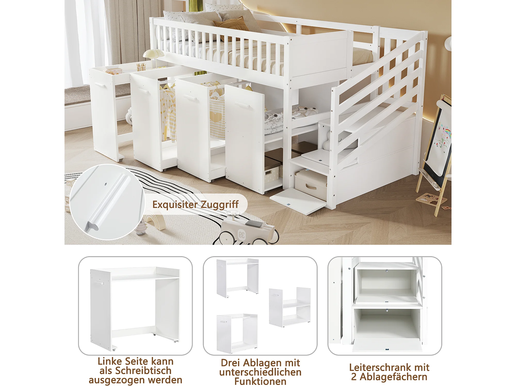 Kinderstapelbed (90x200 cm) met leuningen, bureau met 3 lades en trapje – Dennenhout/MDF, wit en naturel
