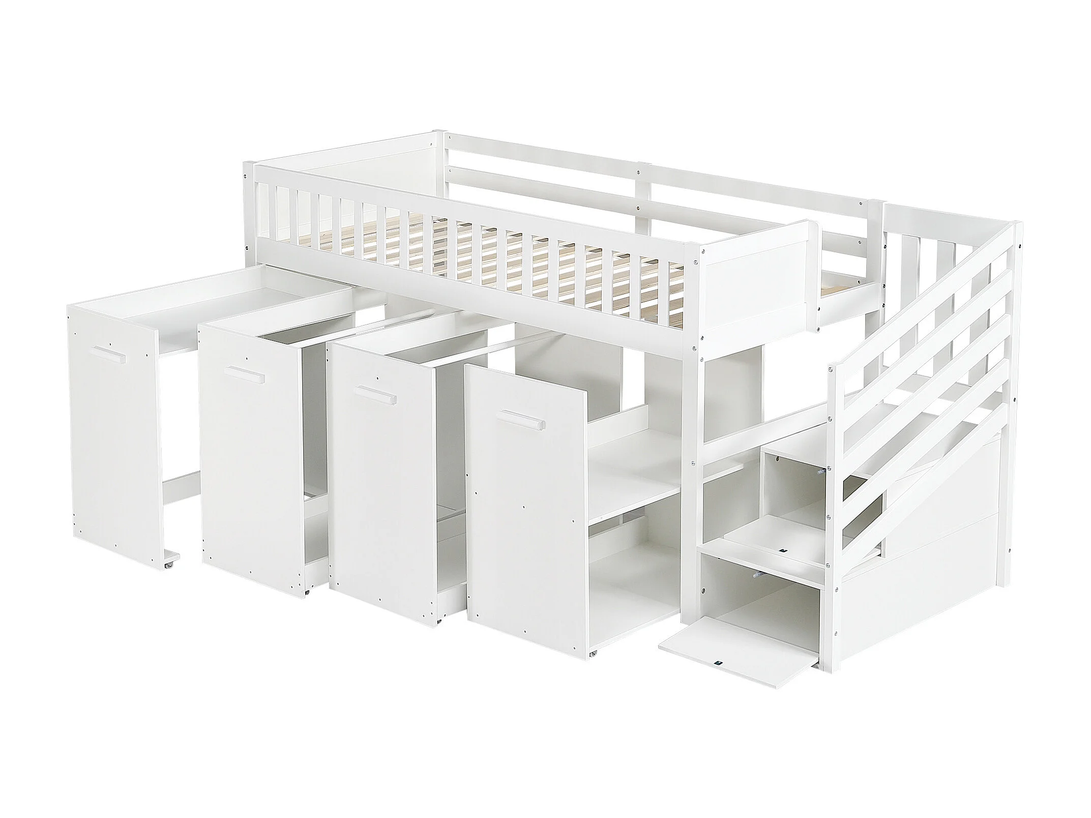 Multifunctioneel stapelbed 90x200 cm voor kinderen met veiligheidsrails, bureau, kledingkast en 2 geïntegreerde opbergvakken, grenen en MDF, wit