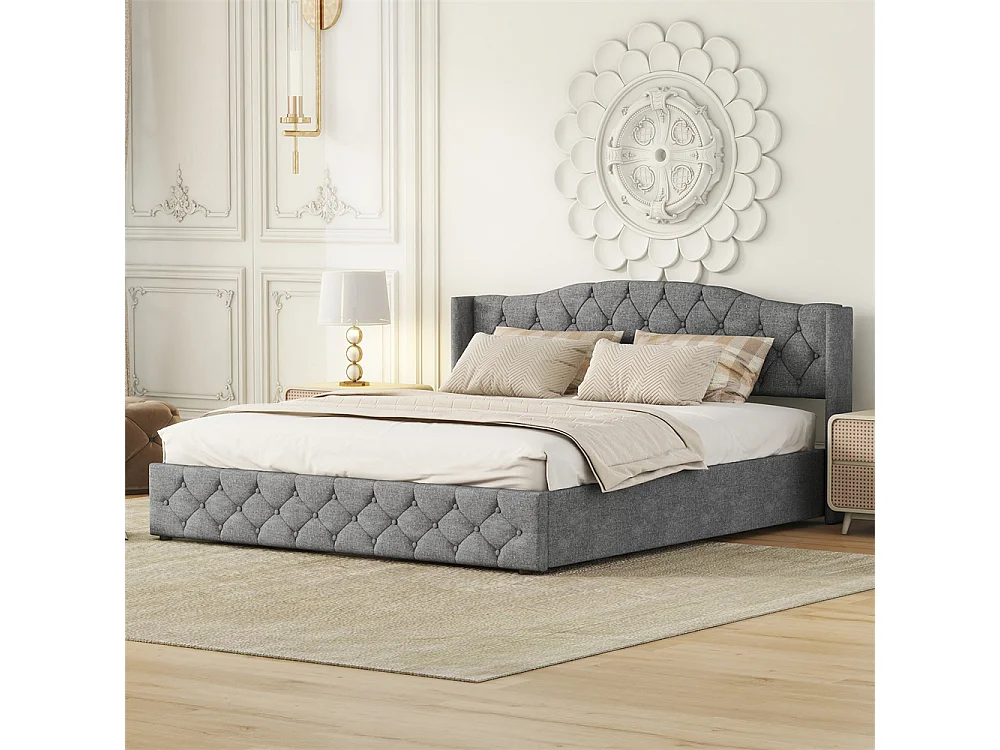 Tweepersoonsbed met opbergruimte, touchlamp en USB Type-C-poorten, grijs linnen frame, massief hout en metaal (232x215x111cm)