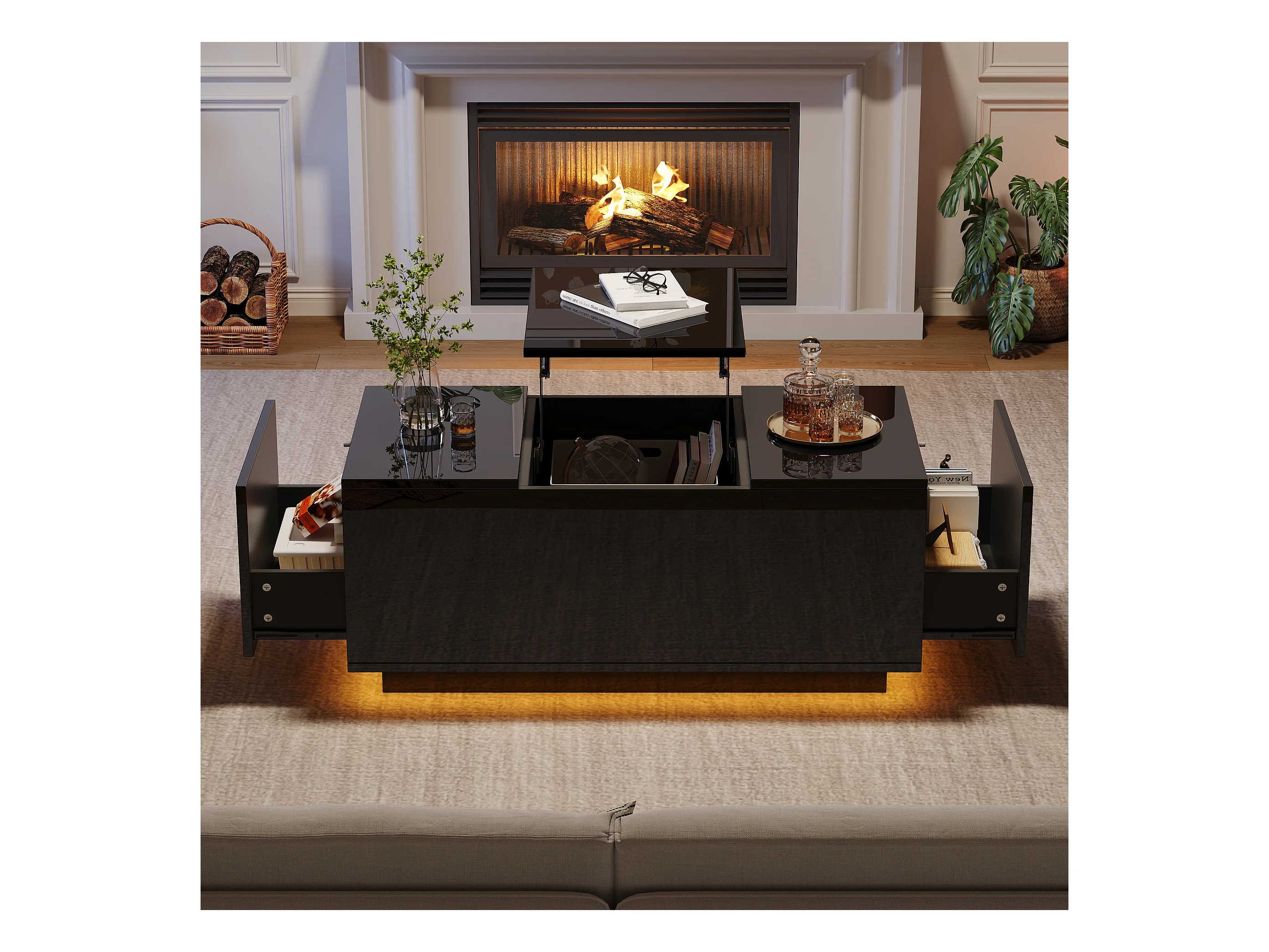 Multifunctionele opklapbare salontafel, spaanplaat, zwart, met ledverlichting en 2 lades (95x48x40cm)