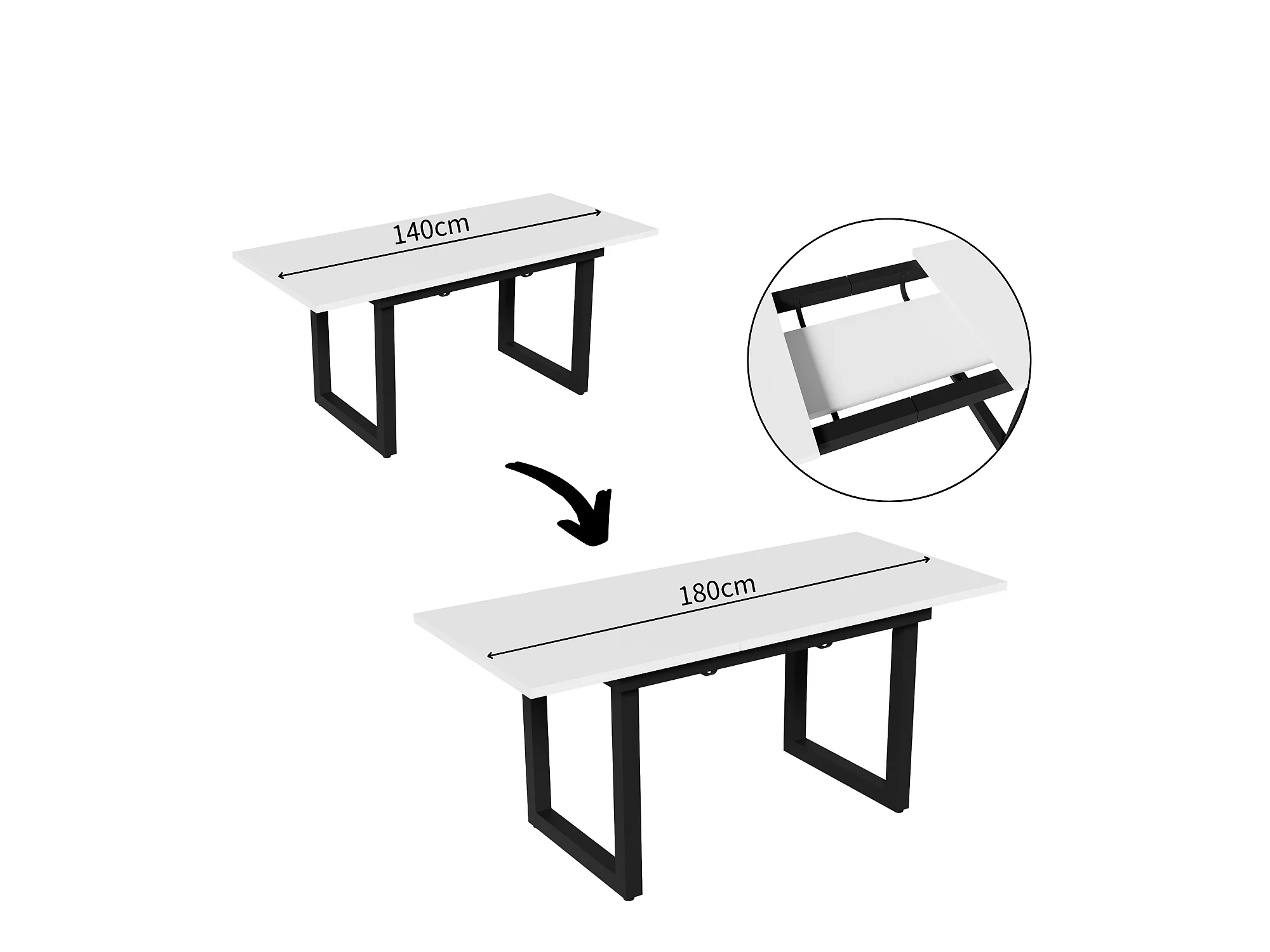Uitschuifbare eettafel voor 4 tot 6 personen - 140/180 x 80 x 75,5 cm - MDF-hout en metalen poten - Wit + zilver