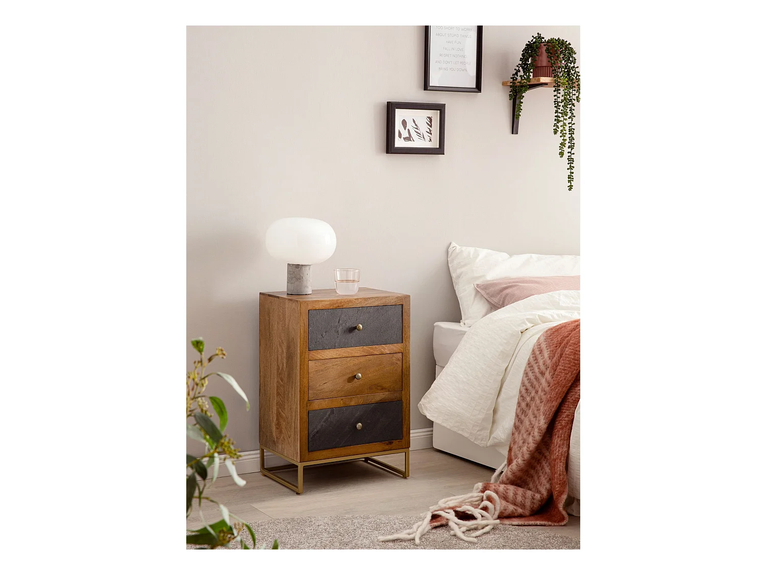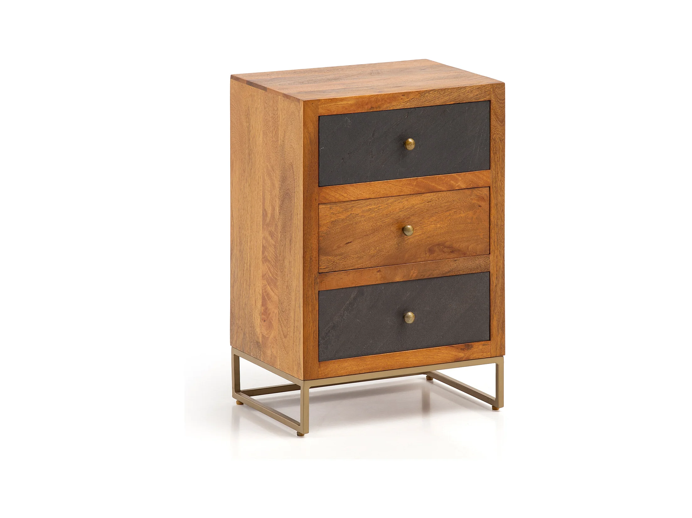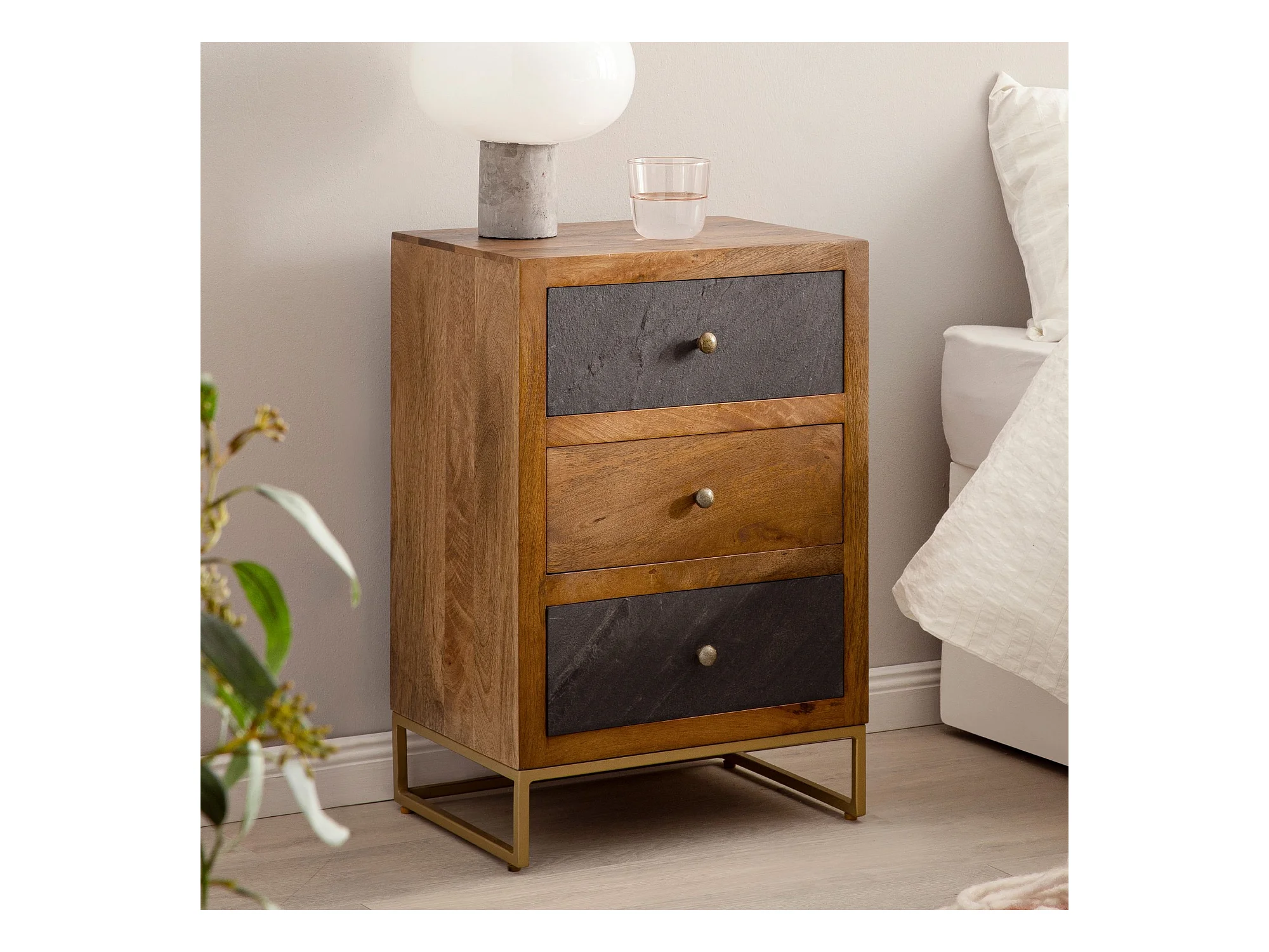 nachtkastje mango massief hout/steenlook 40x60x30 cm nachtkastje boxspringbed | Design nachtkastje bruin met 3 lades | Nachtkastje met opbergruimte en metalen frame