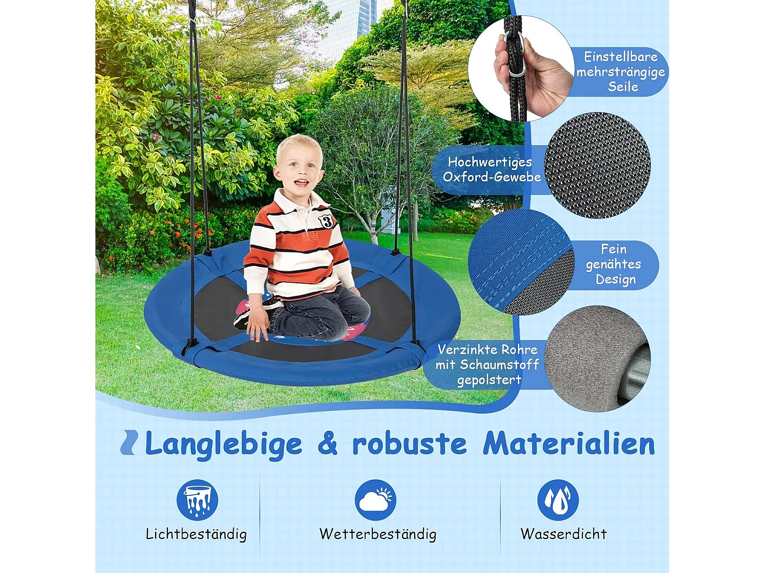 Nestschommel, vierkant,150 x 80 cm, boomschommel met 100-180 cm verstelbaar touw, kinderschommel, outdoor tuinschommel voor kinderen en volwassenen (blauw) ZB33885