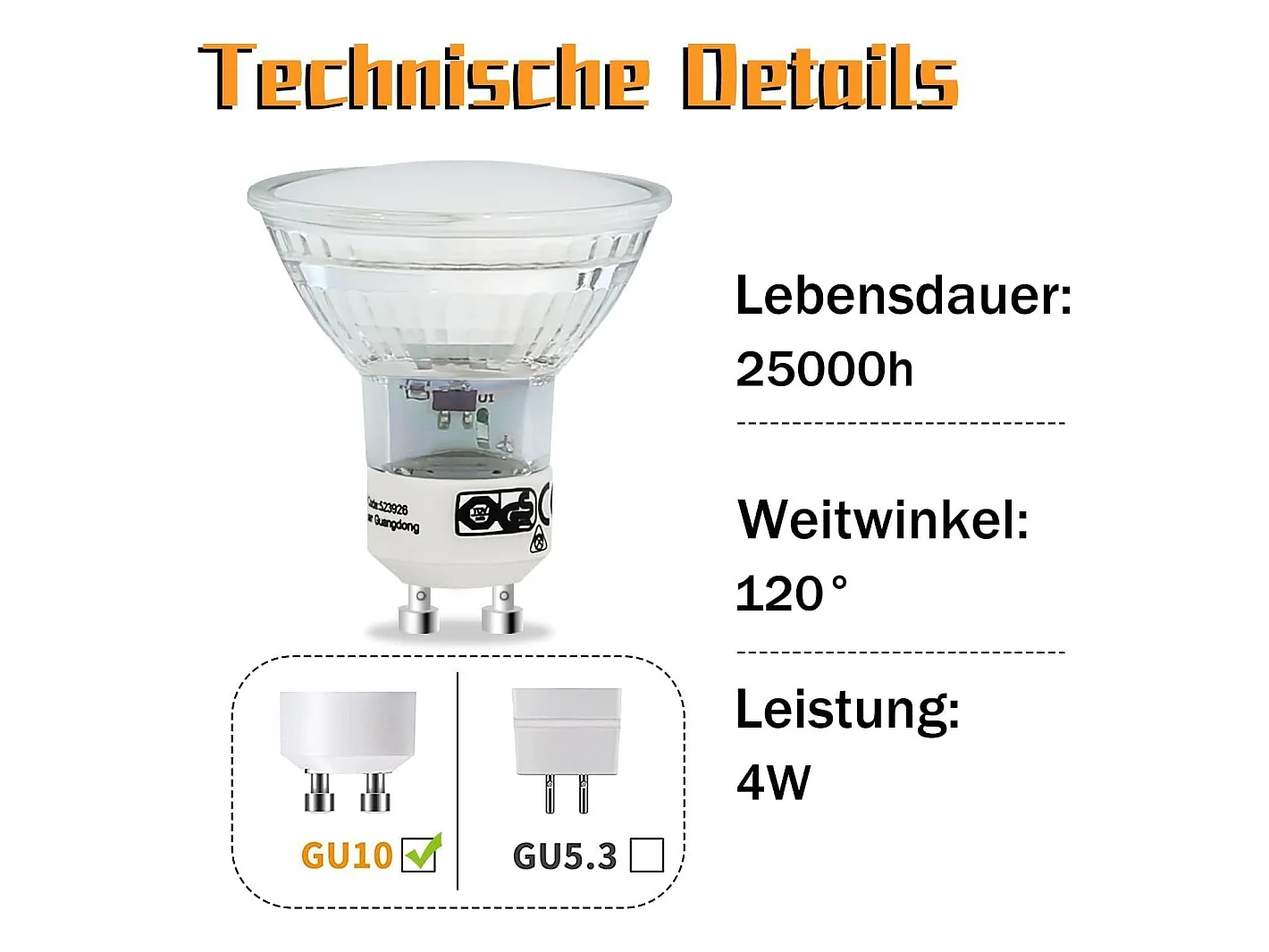 NETTLIFE Pakket van 10 LED - GU10 - lampenstekkers, witte warmte, 4W - PAR16 - inbouwspotjes, straalhoek 120°, verlichting 3000K, keukenlamp, plafondlamp.