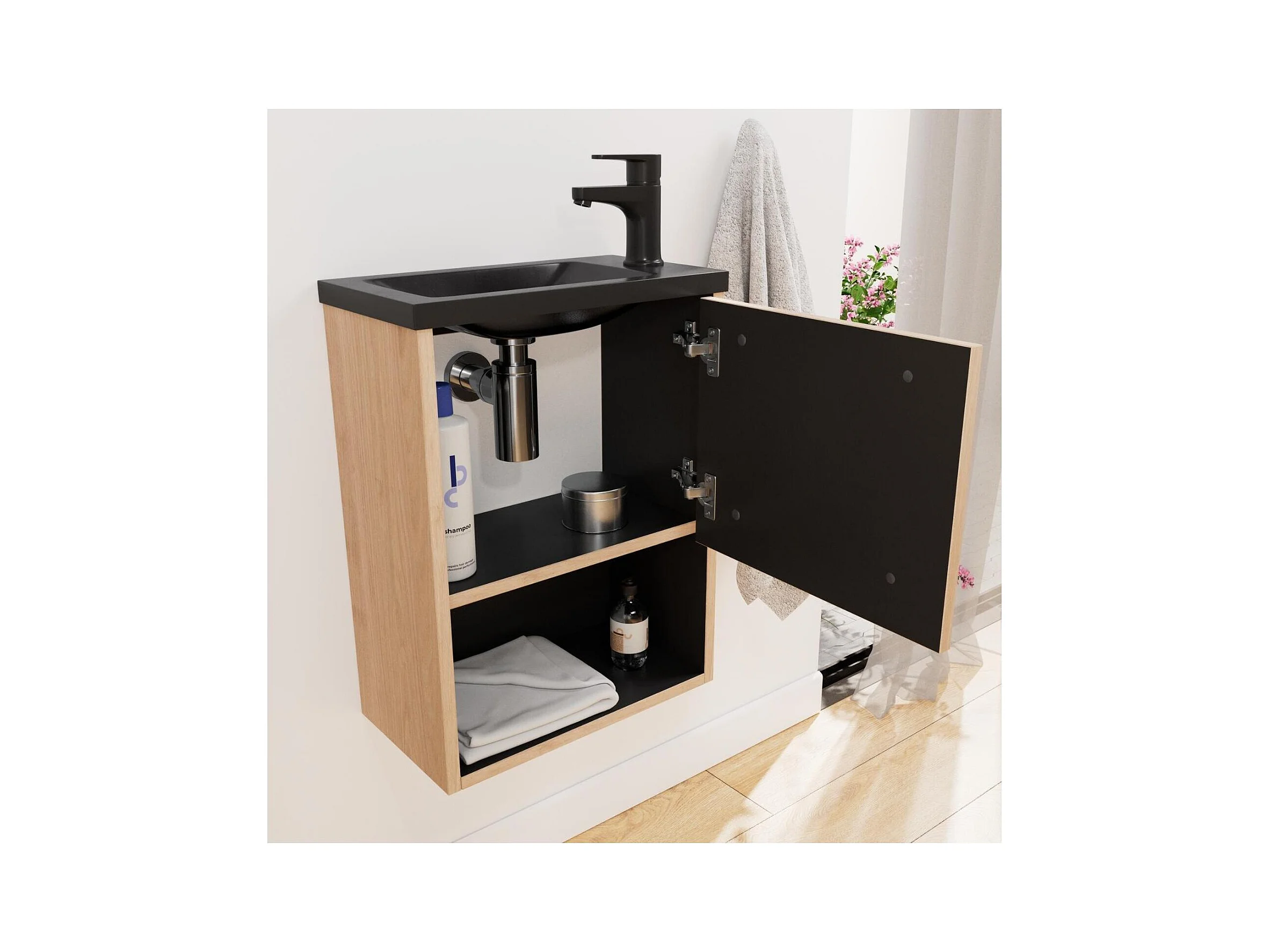 NOVA wandgemonteerde wastafelmeubel van metaal en hout met een harswastafel van 40x50 cm