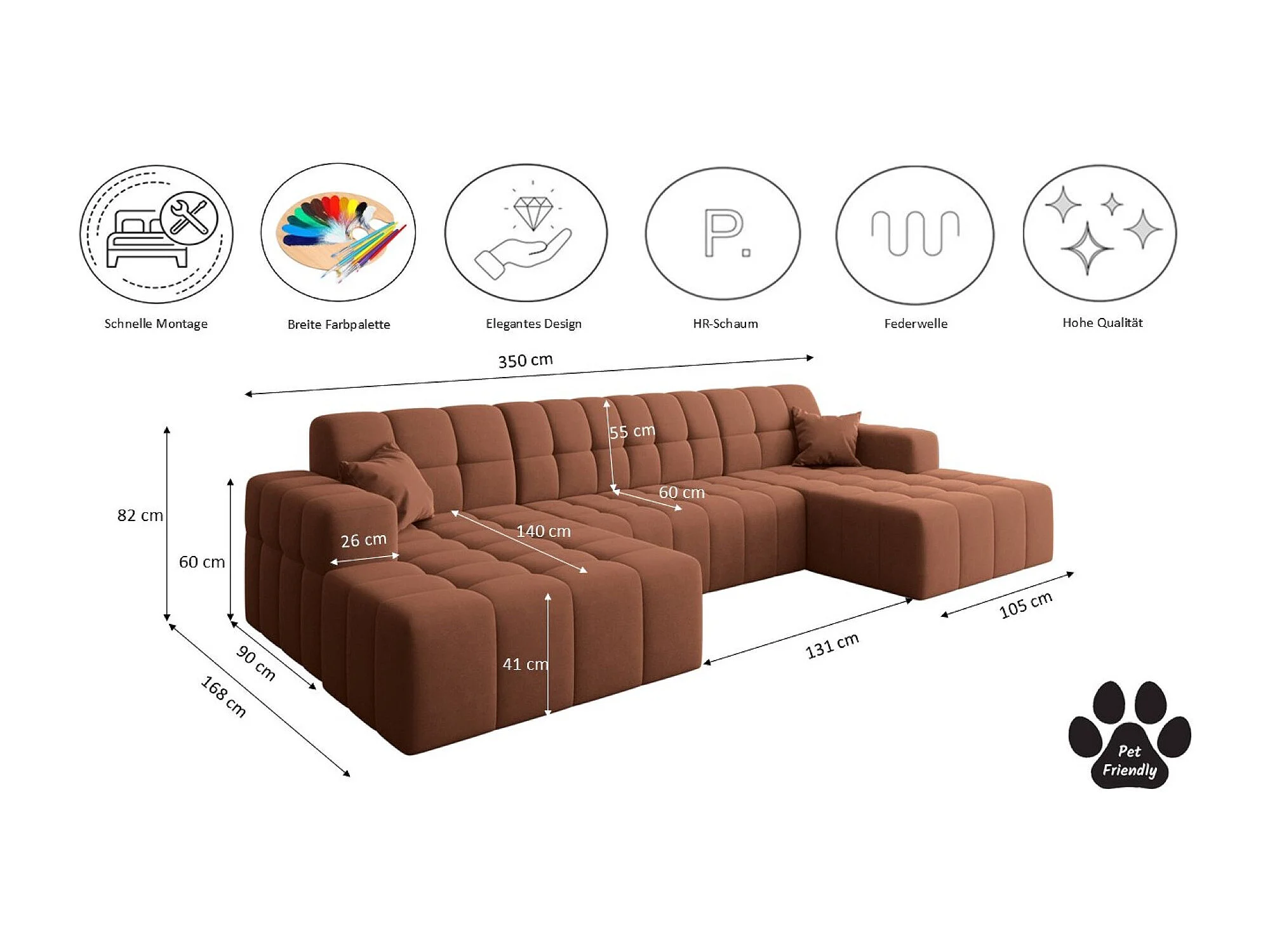 Hoekbank, Sofa Designer Modena U Pure stof Bron Koper