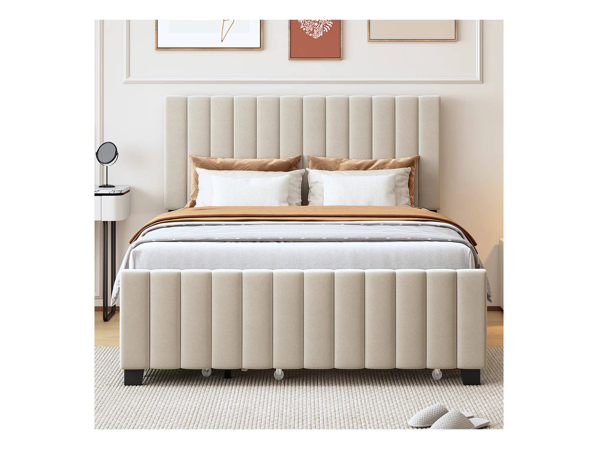 Gestoffeerd bed 140x190cm, met lattenbodem en hoofdbord, met in hoogte verstelbaar hoofdbord, fluweel, beige