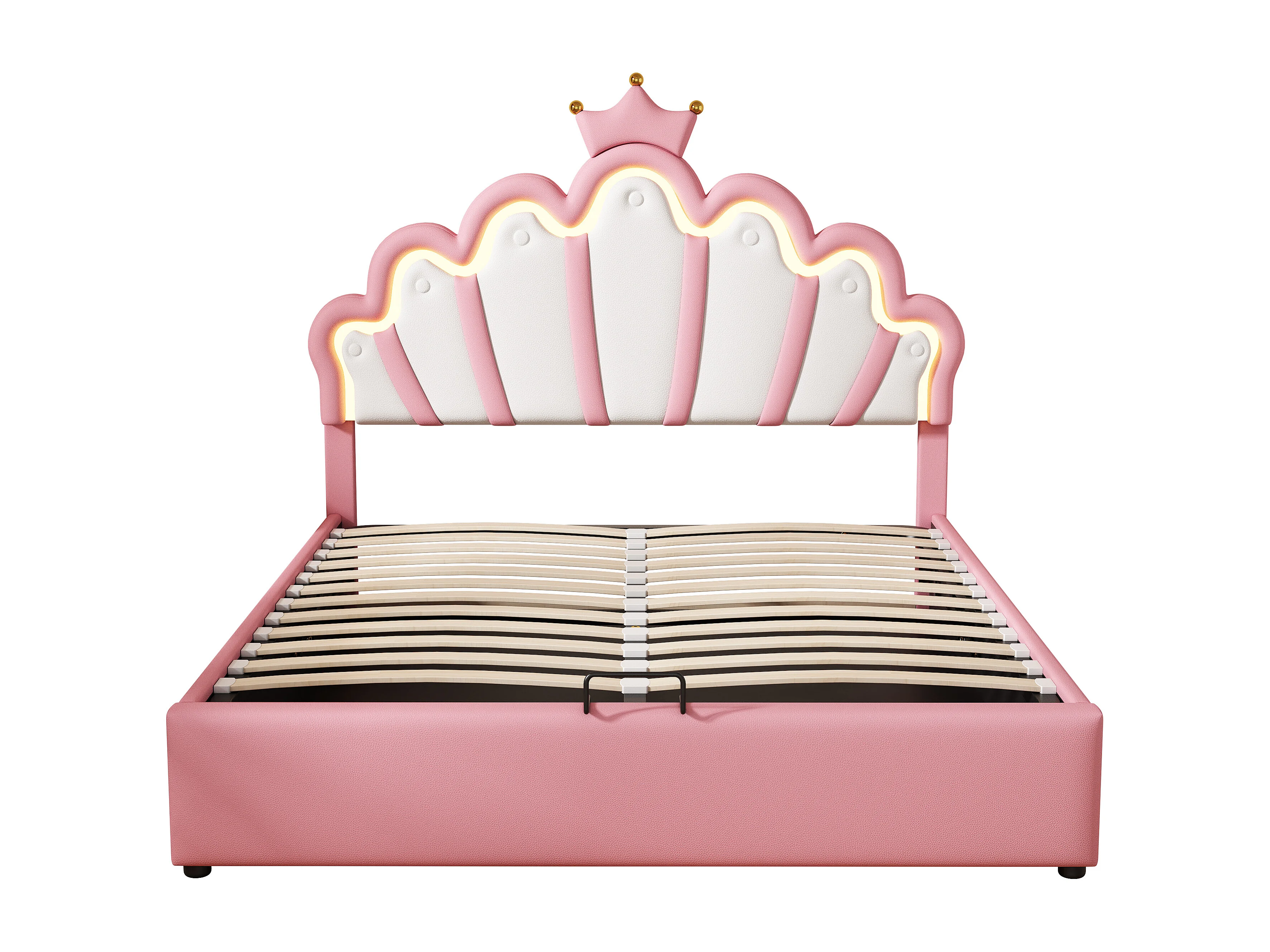 Kroonvormig opbergbed van 140 x 200 cm - Prinsessenbed - PU-leer - LED-verlichting - Roze
