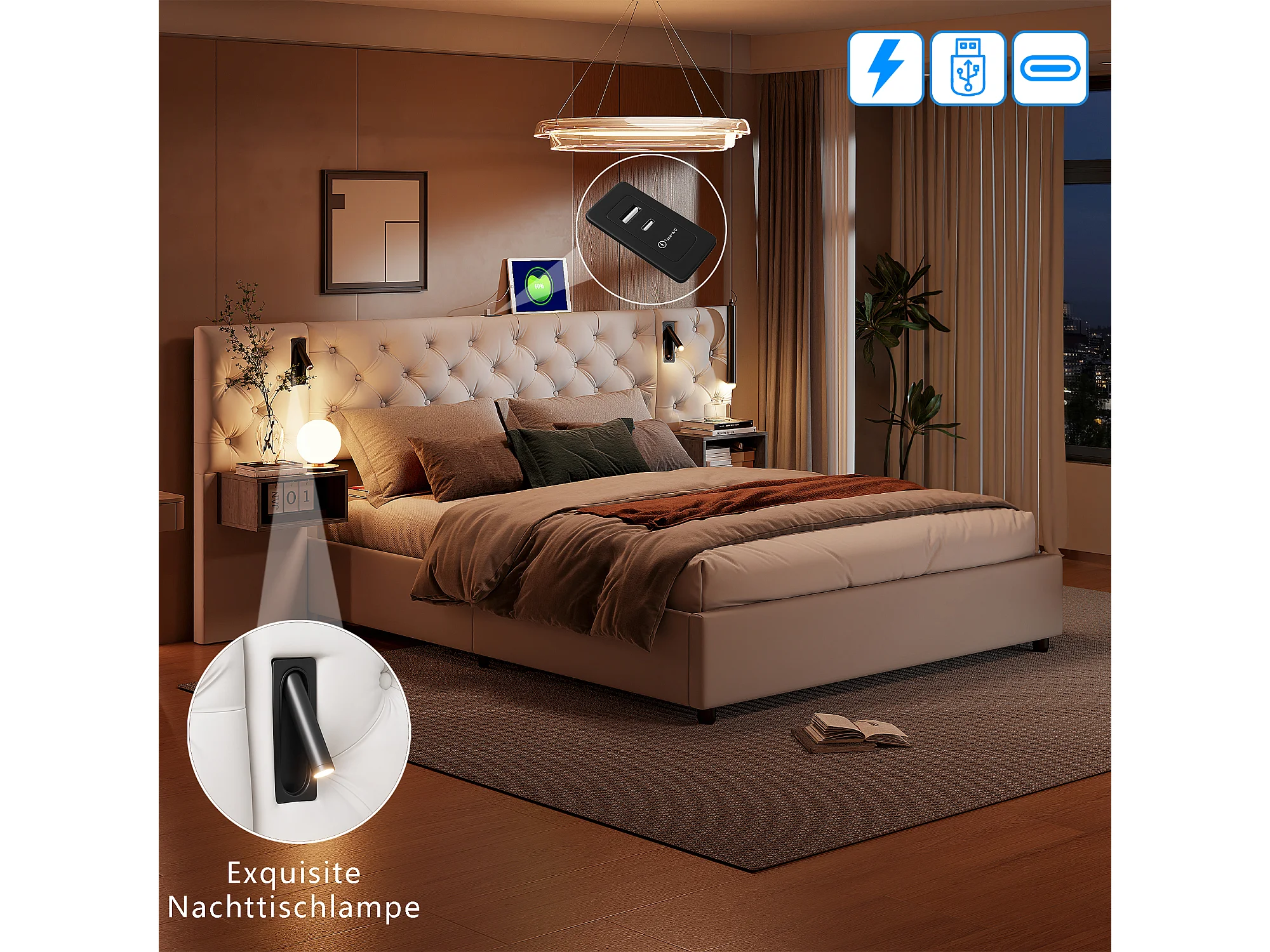 Opbergbed van 140 x 200 cm met ledverlichting en USB-aansluiting, lattenbodem, fluweel, wit