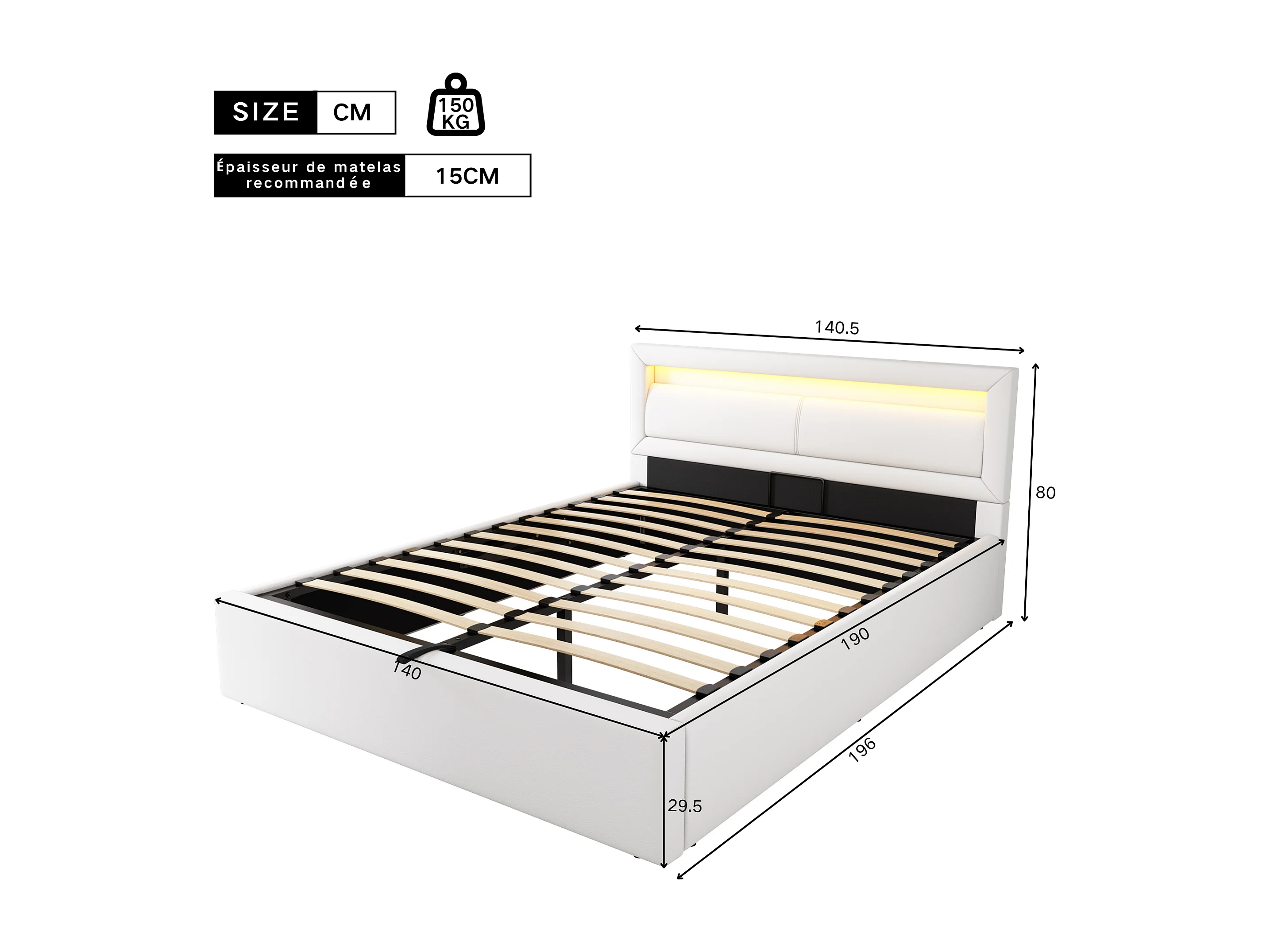Opbergbed 140x190 cm wit met LED, kunstleer + MDF, lattenbodem, zonder matras