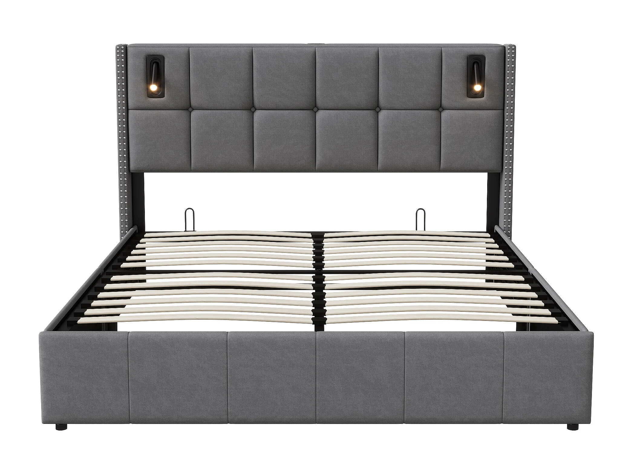 Bed 140x200 cm met opbergruimte, gestoffeerd tweepersoonsbed met leeslamp, hydraulische opbergfunctie, lattenbodem, zonder matras, fluweel, grijs