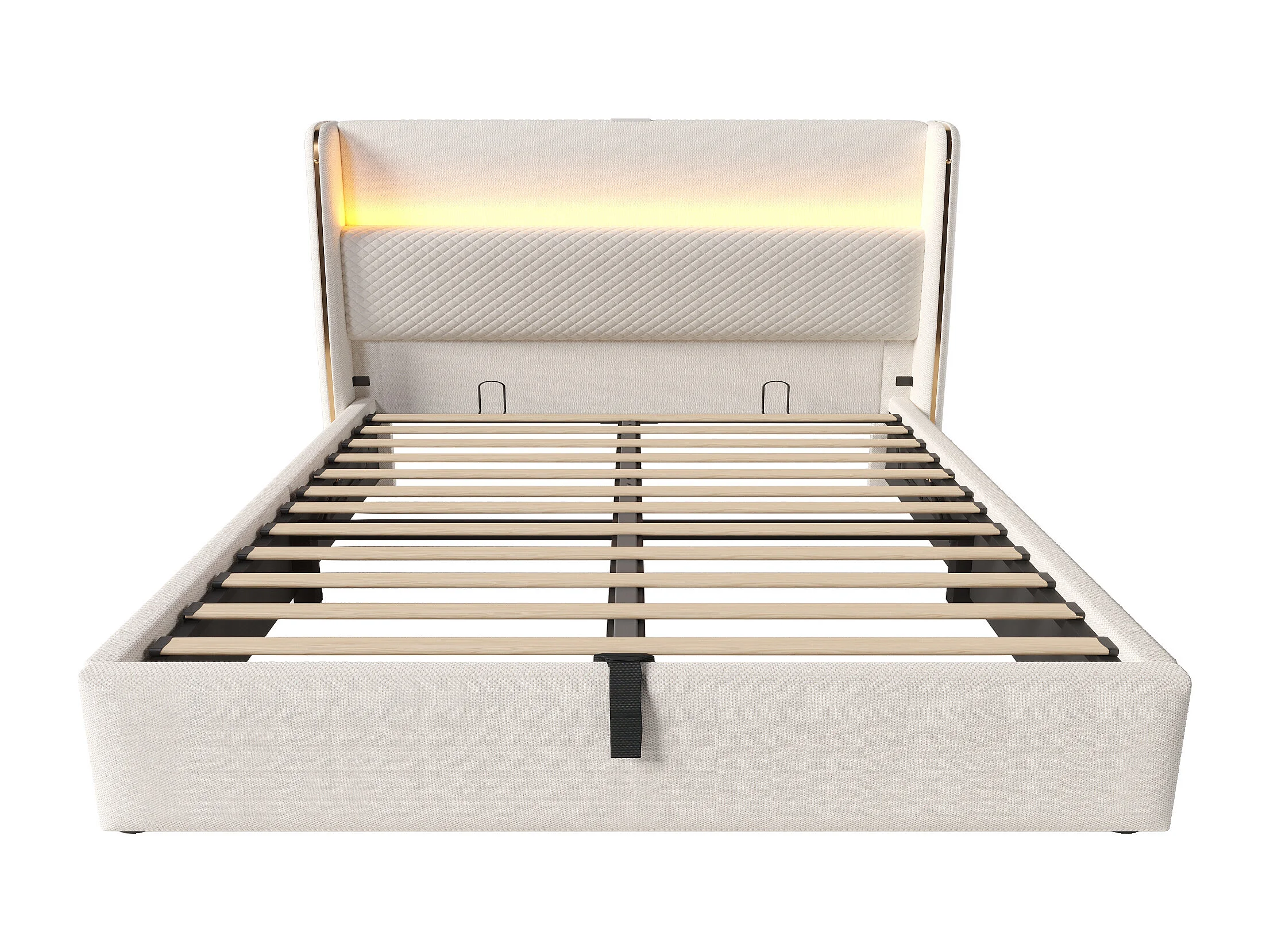 Opbergbed 140x200 cm Volwassen bed met LED en USB-aansluiting, gewatteerd hoofdeinde - beige linnen (met matras)