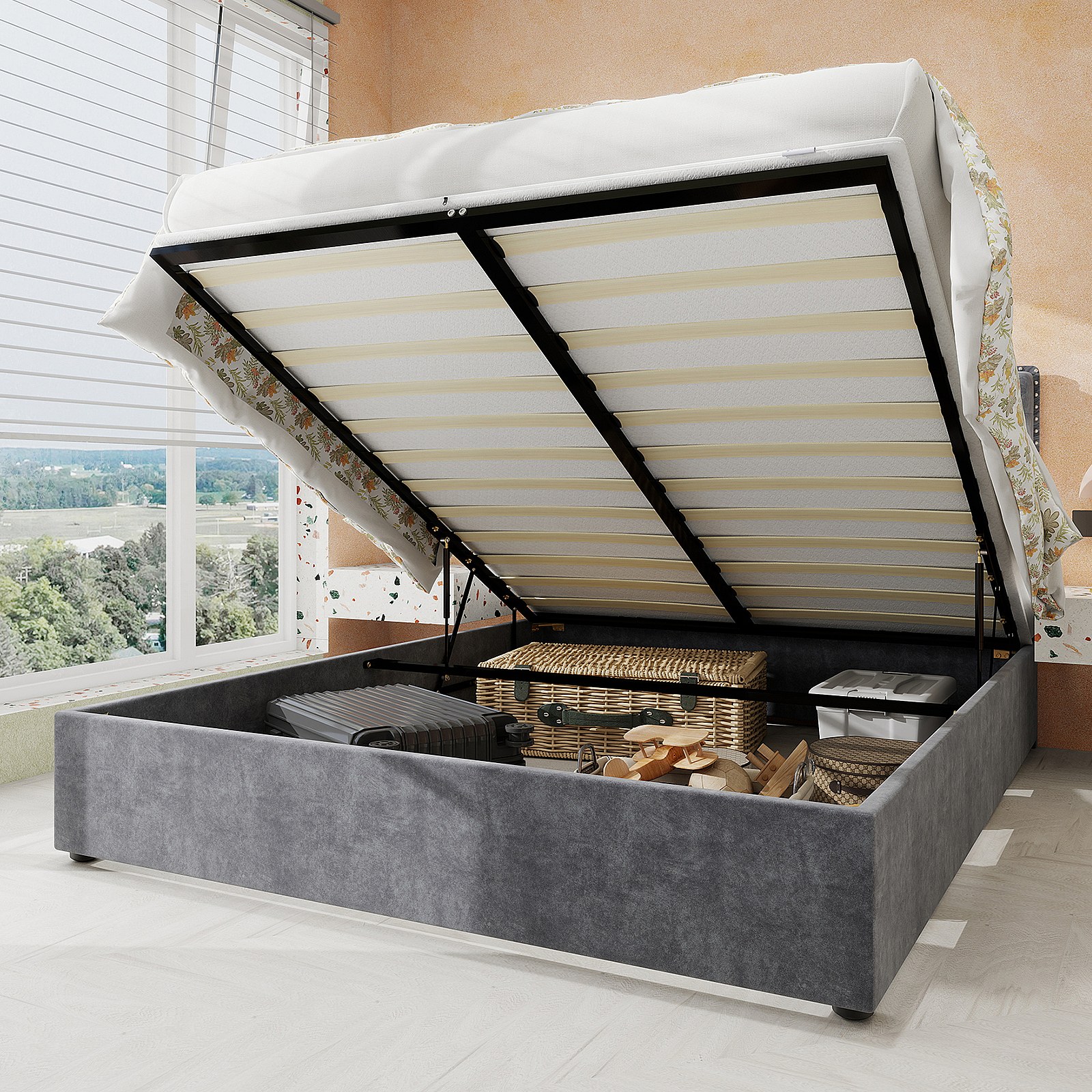 Tweepersoons opbergbed 160x200 cm met hydraulisch systeem, houten lattenbodem en grijze fluwelen bekleding (zonder matras)