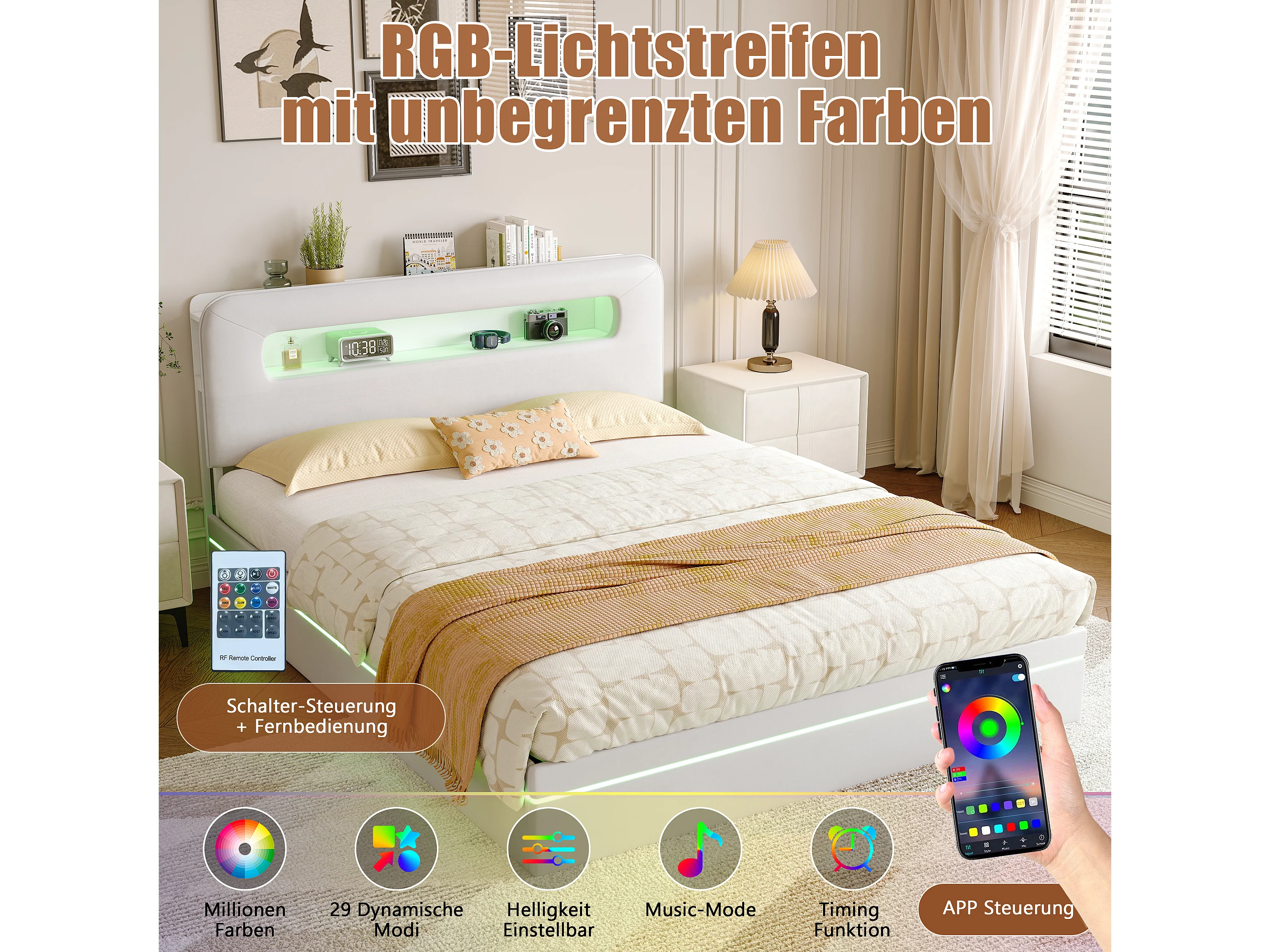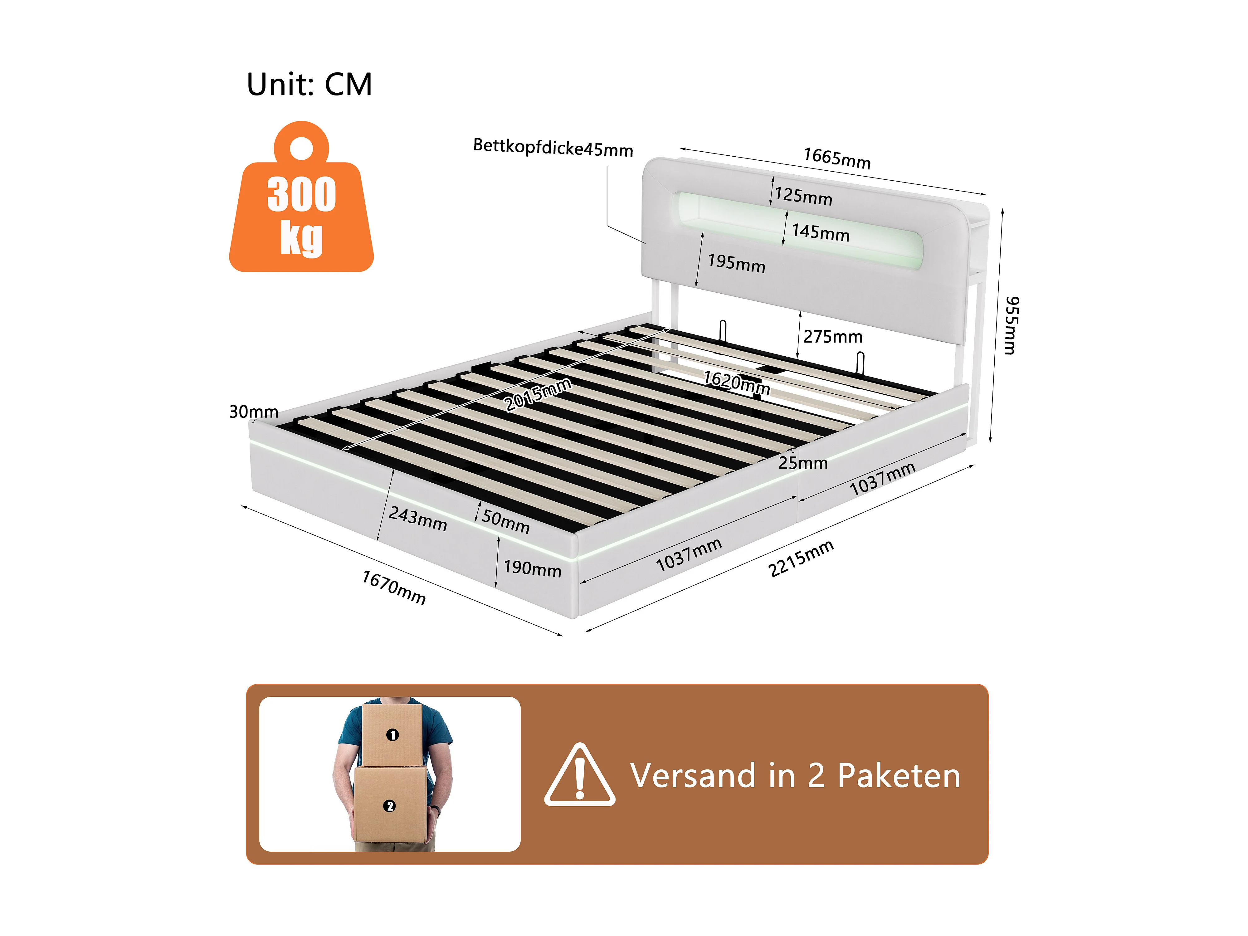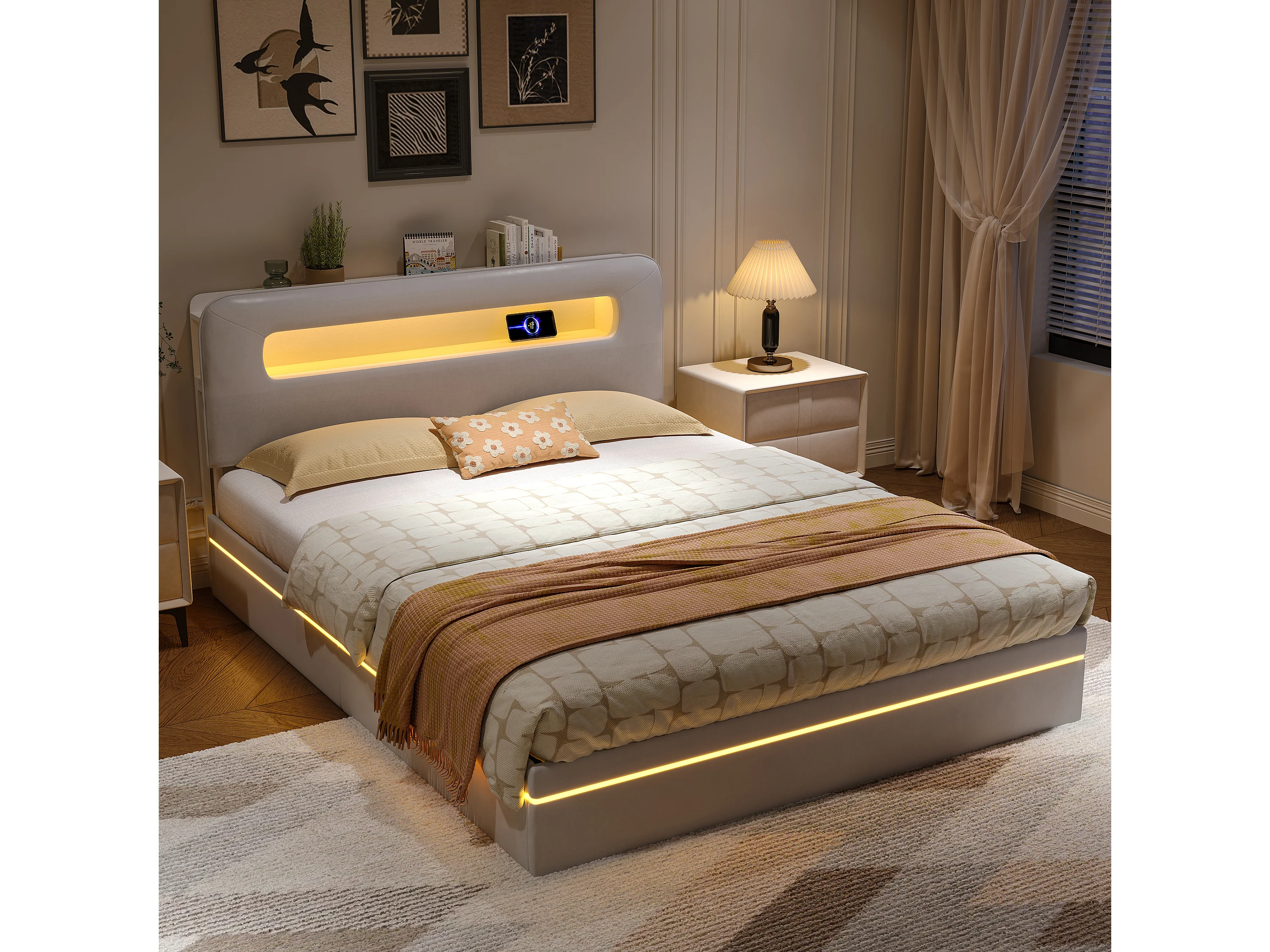 Opbergbed 160x200 cm met hoofdeinde, ledverlichting en hydraulische opening, fluweel, beige