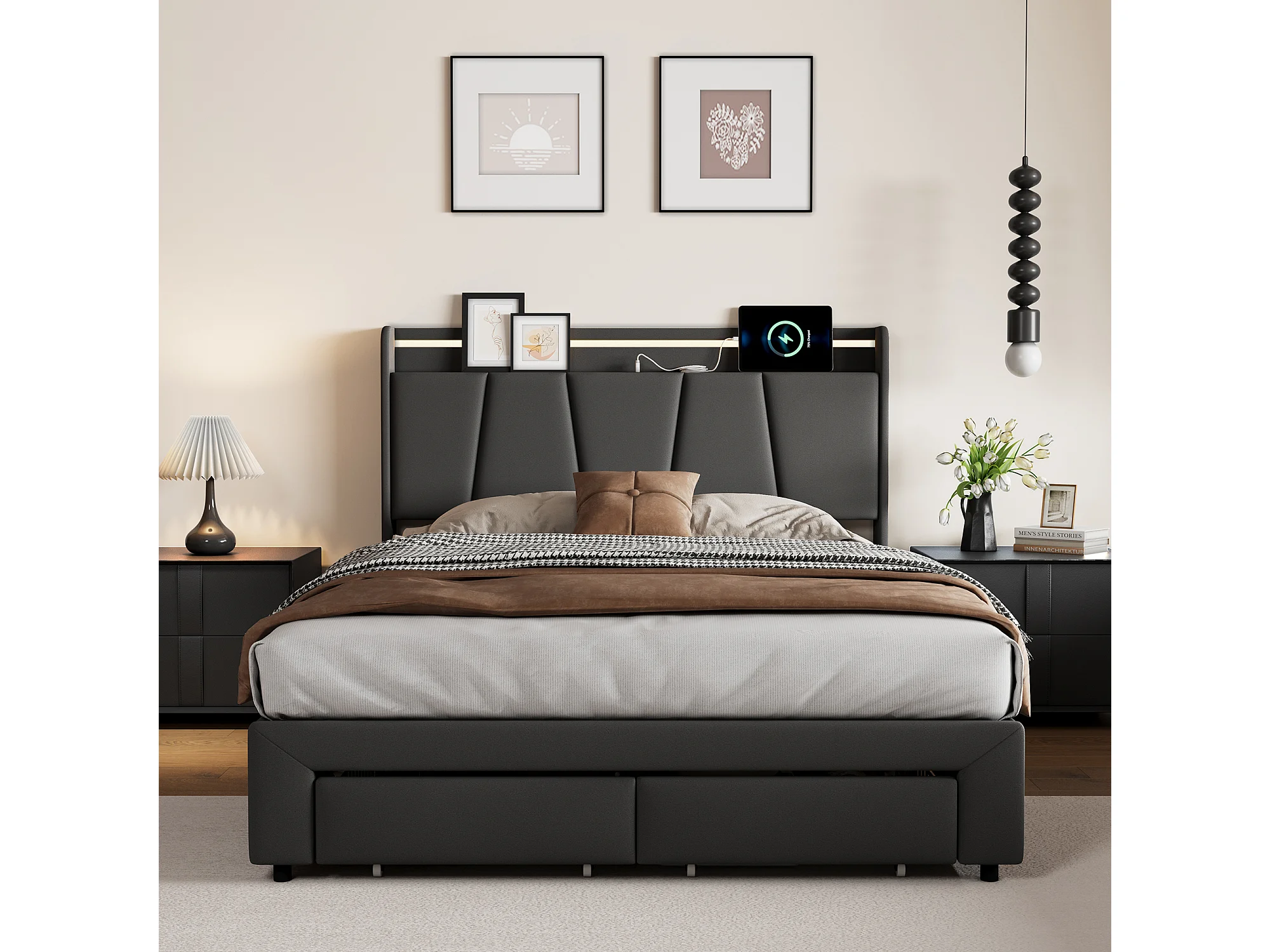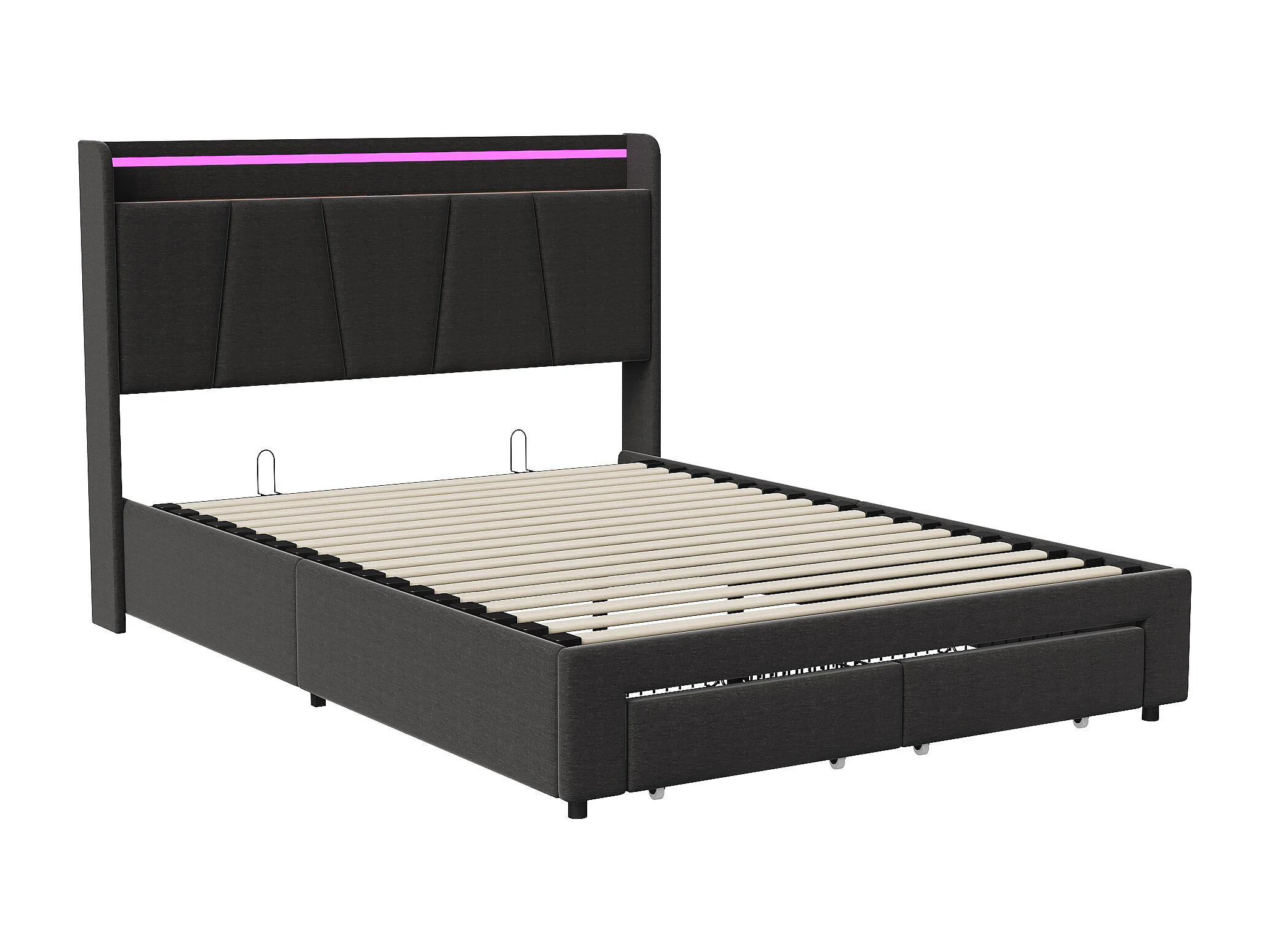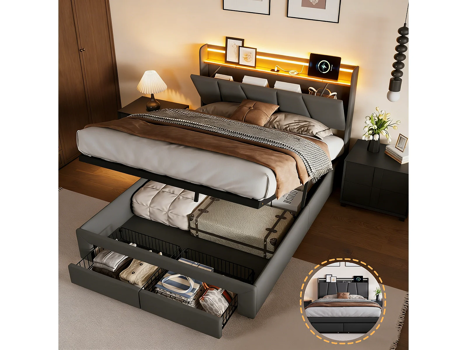 Opbergbed 160x200cm, gestoffeerd tweepersoonsbed met ledverlichting en usb-poort, gewatteerd bed met 2 lades en hoofdbord, linnen, donkergrijs