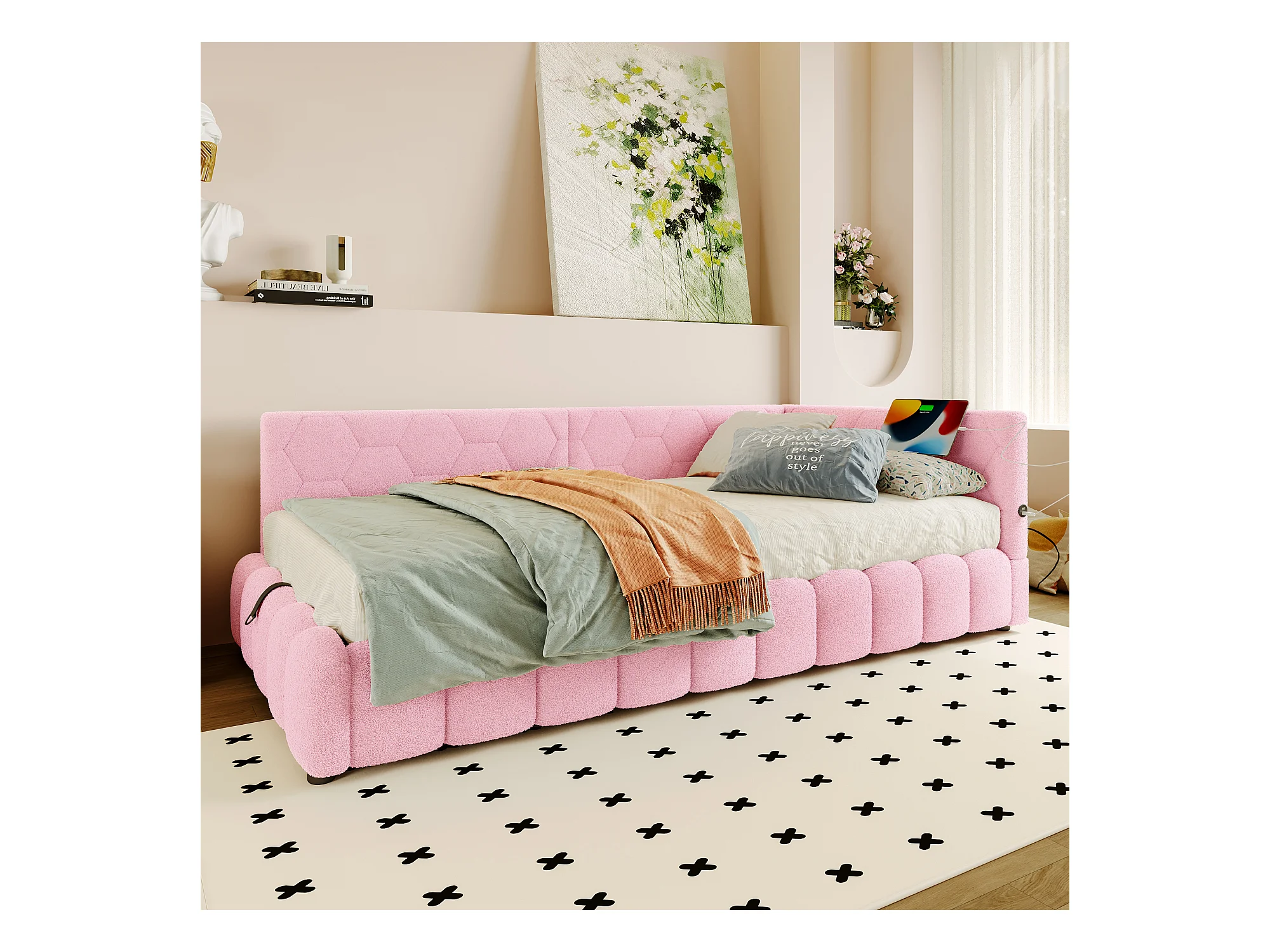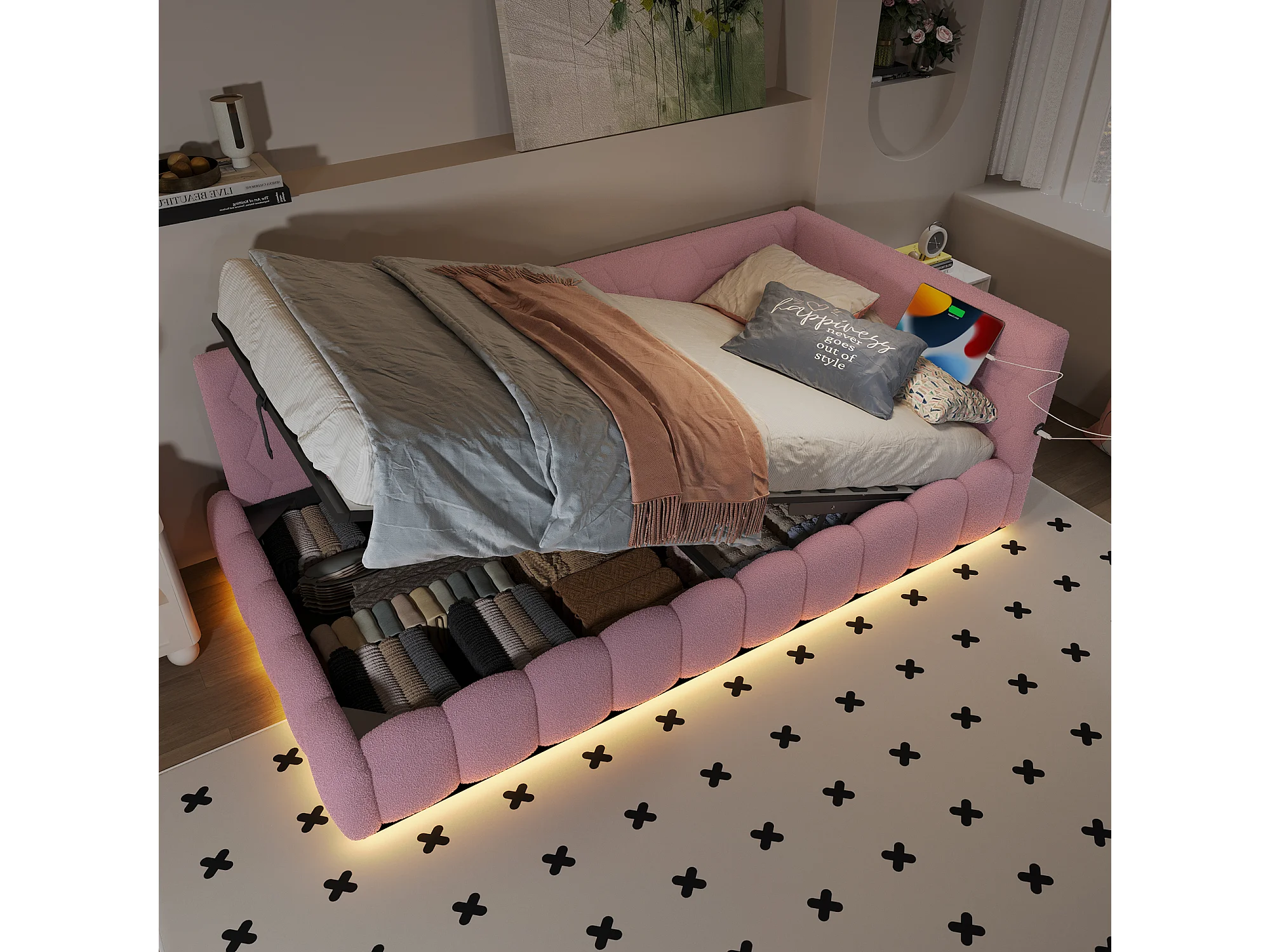 Opbergbed 90x200 cm - Kinderbed met LED-verlichting en USB-oplader - roze - zonder matras
