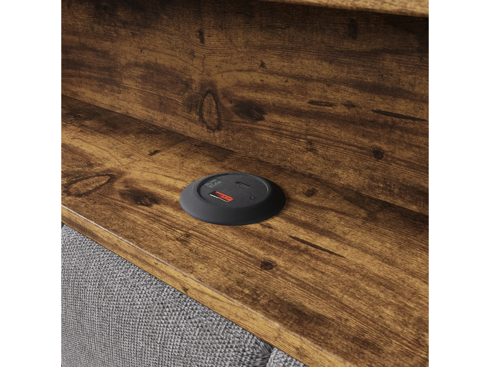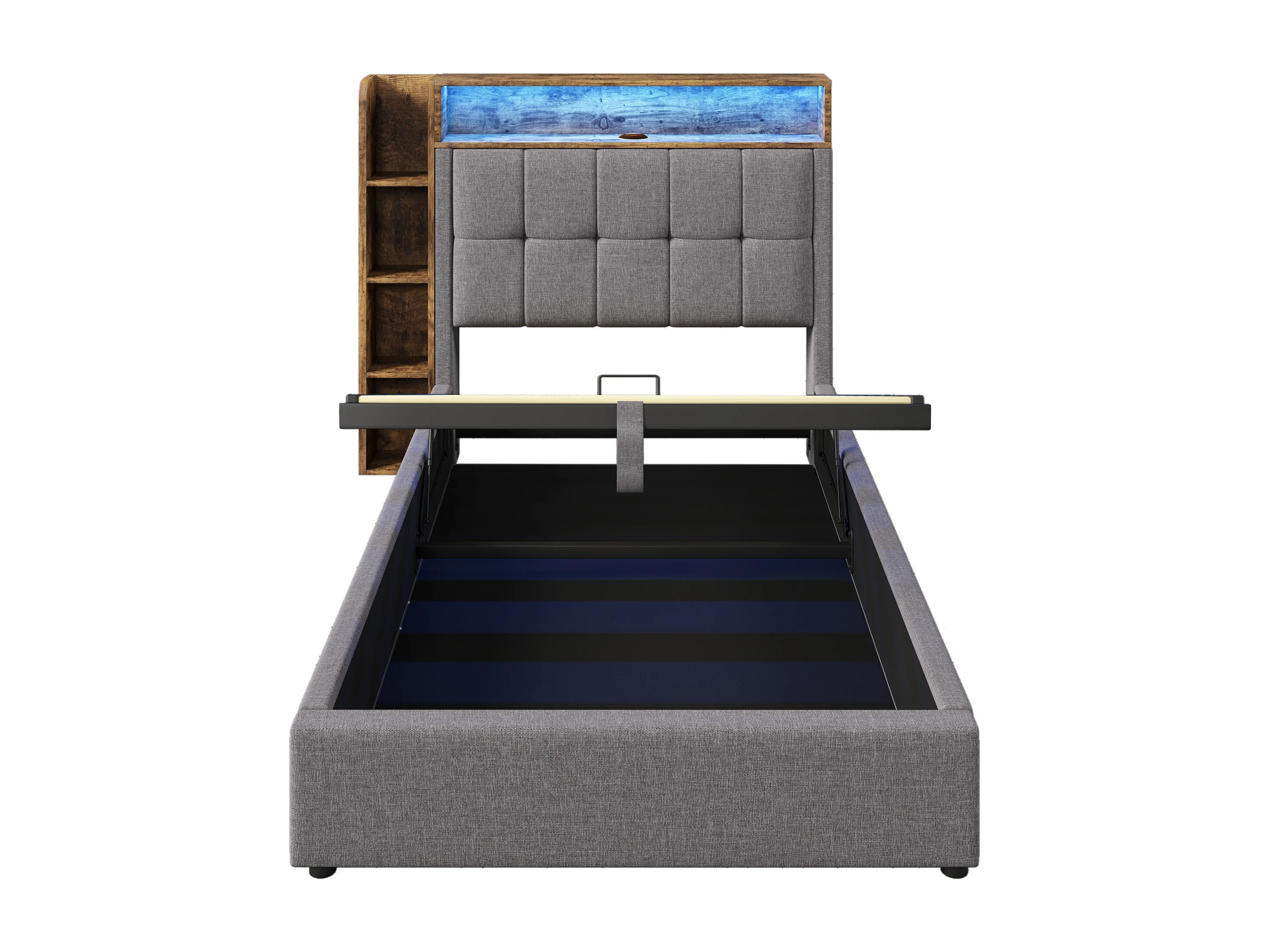 Opbergbed 90x200 cm - met hoofdbord met opbergruimte en ledverlichting - grijs linnen - matras niet inbegrepen