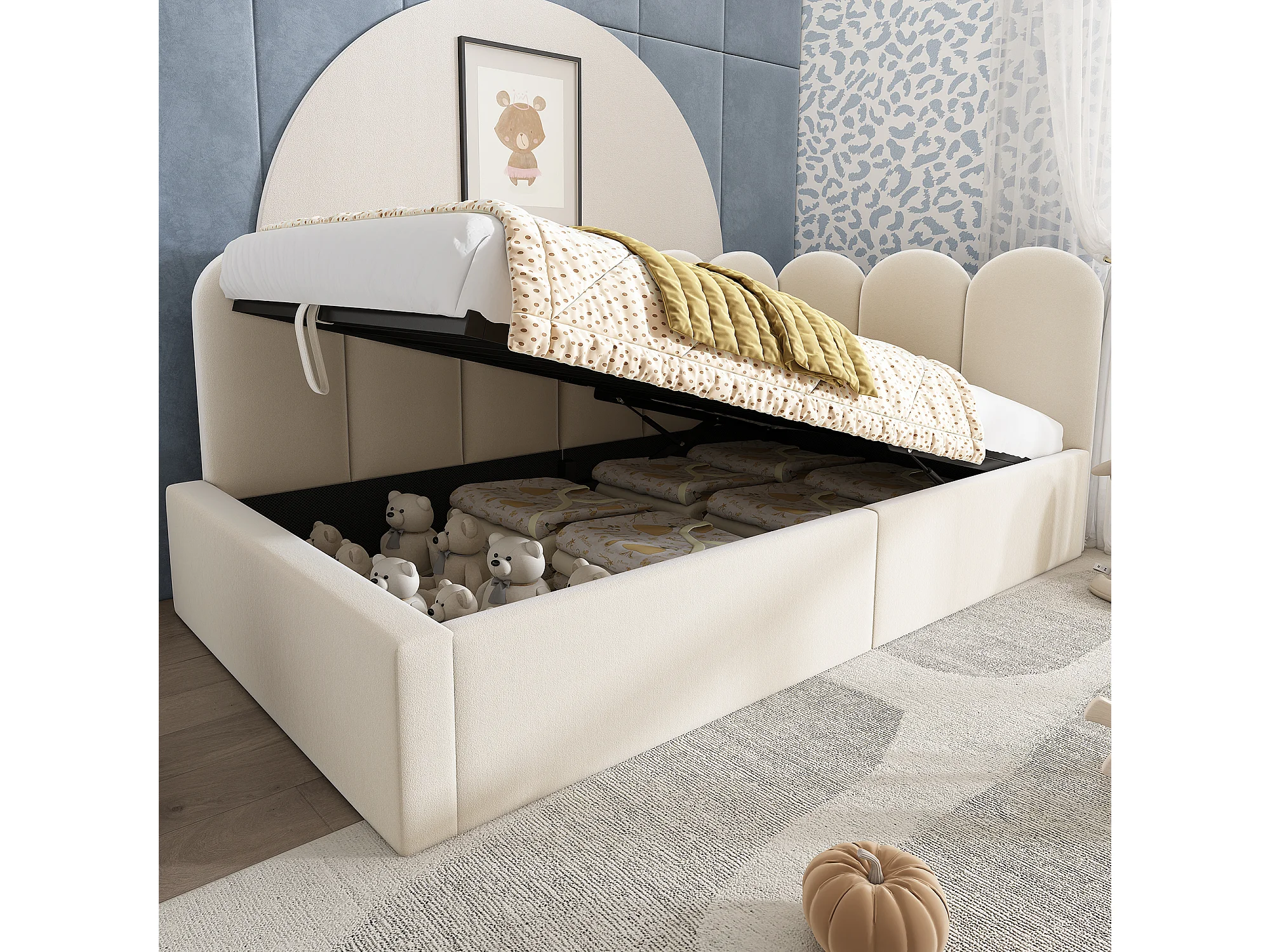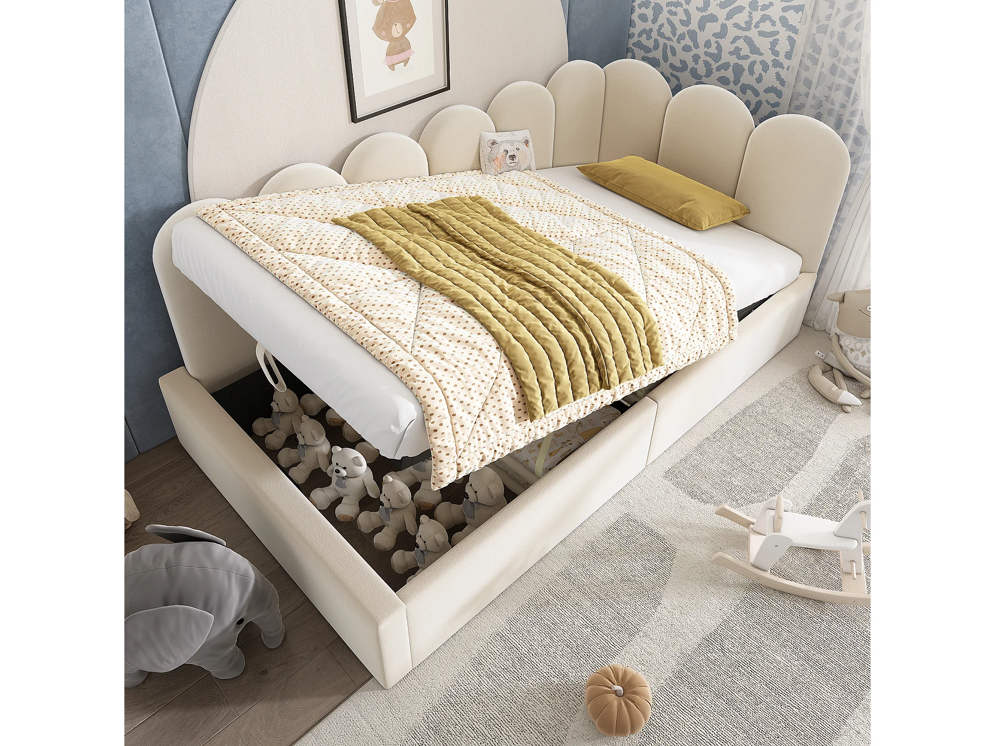 Opbergbed kind 90x200 cm, metalen frame, beige fluwelen bekleding, zonder matras