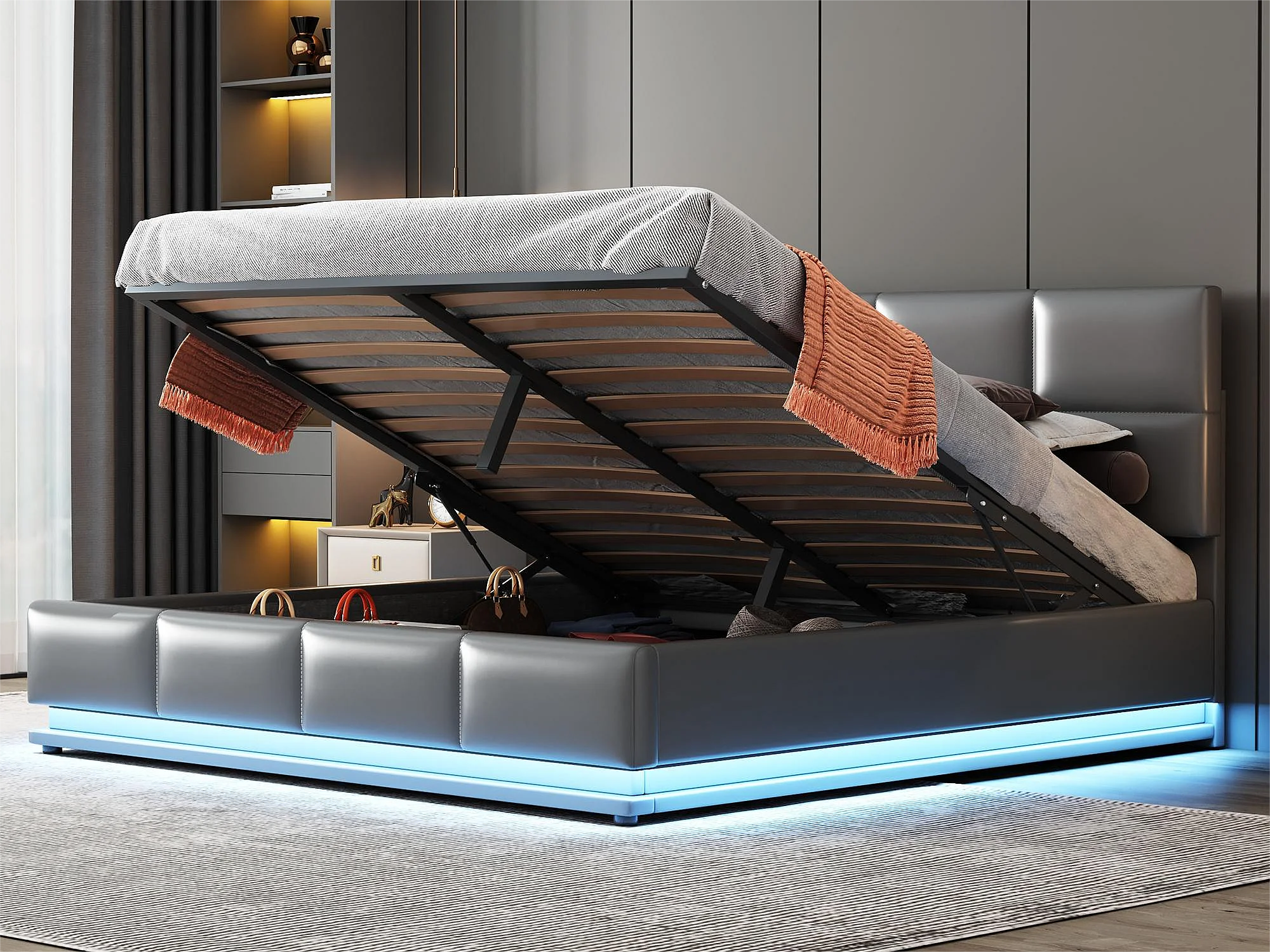 Opbergbed met verstelbaar hoofdeinde - 160 x 200 cm - PU-leer - LED's - grijze kleur
