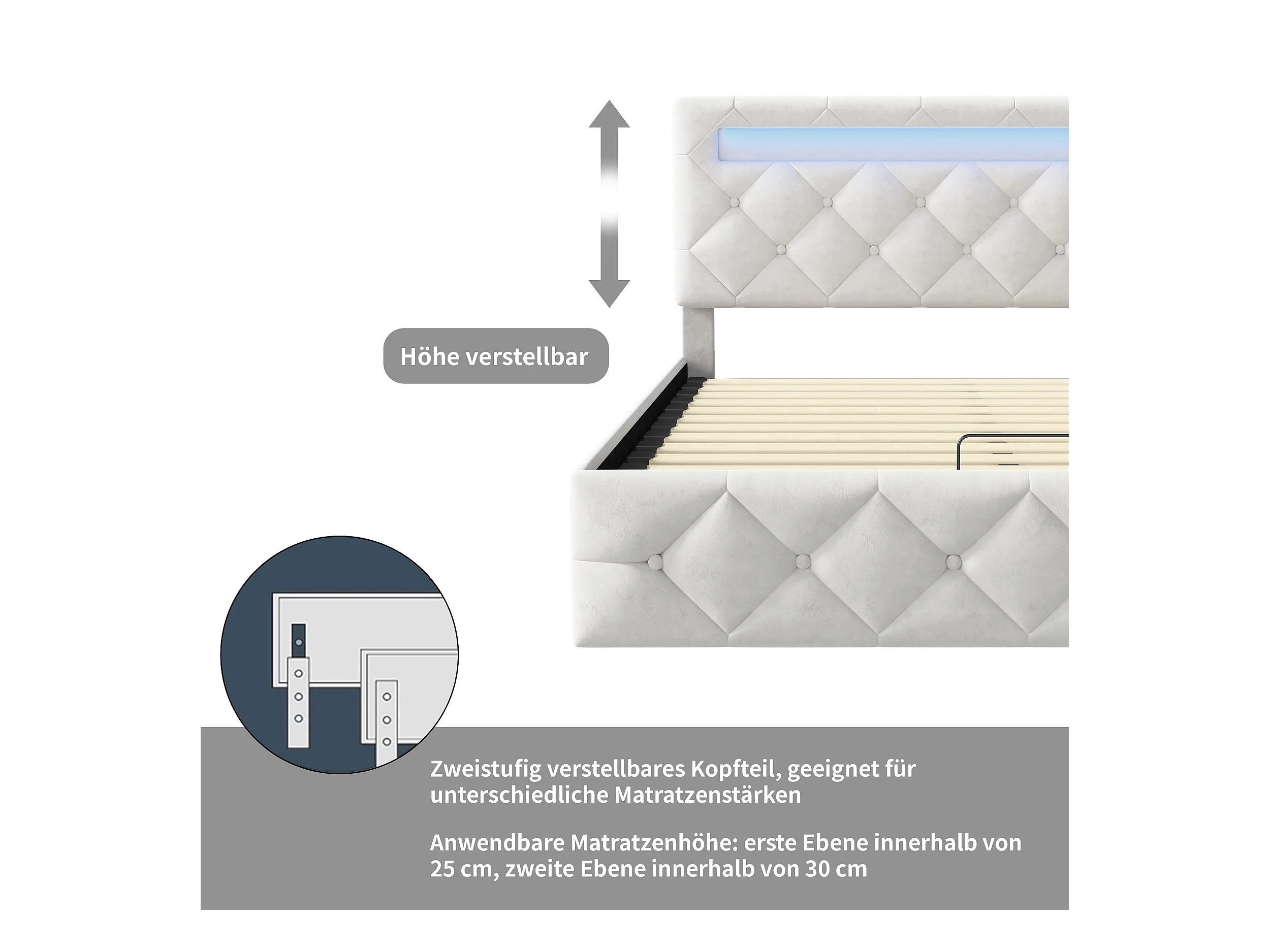 Opbergbed van 140x200 cm in abrikooskleurig fluweel met veelkleurige leds, verstelbaar hoofdeinde, EU-stekker en hydraulische opbergruimte