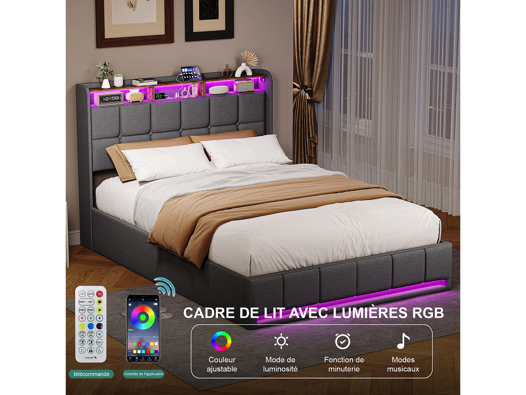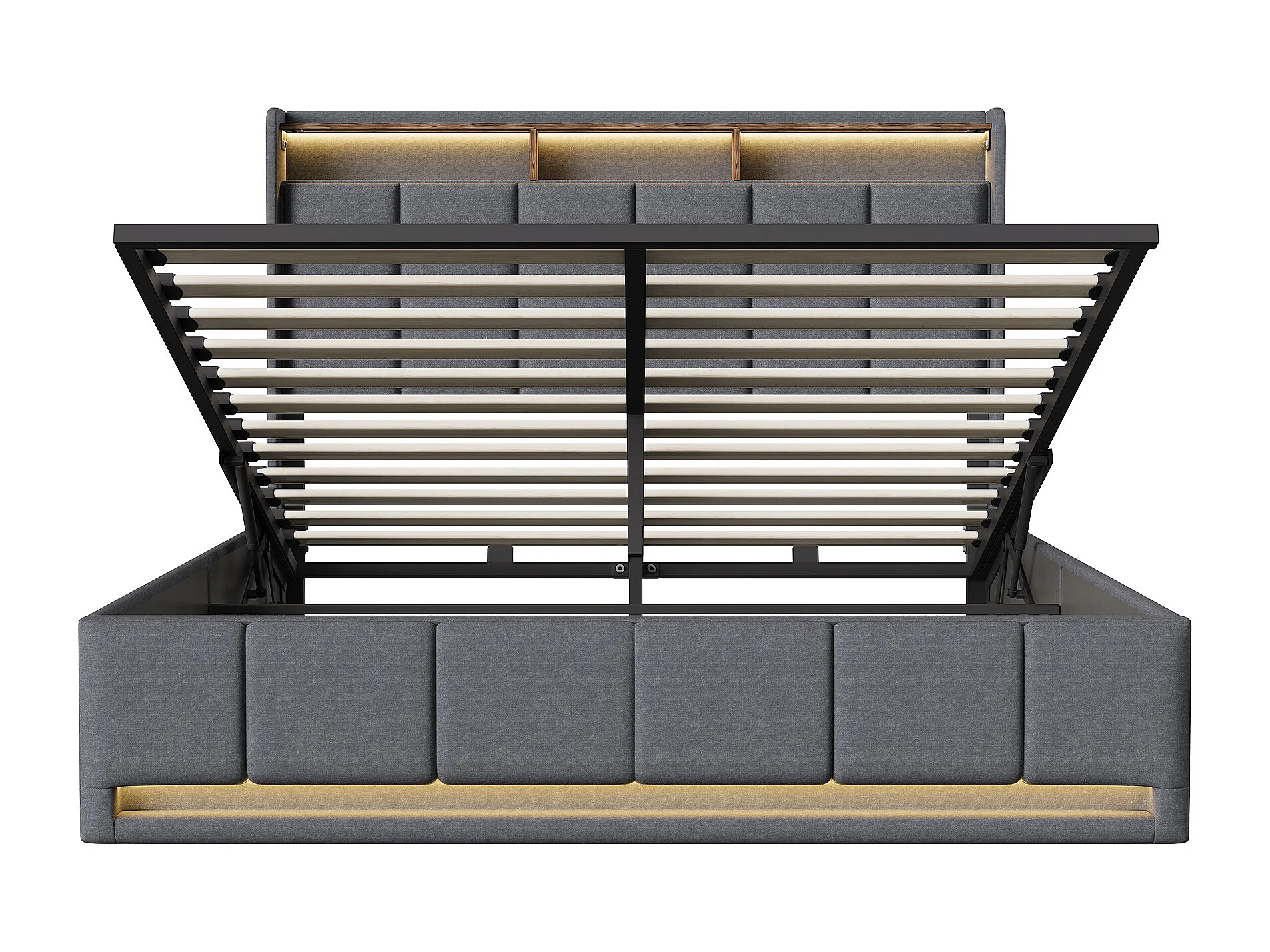 Opbergbed van 140x200 cm met ledverlichting, USB- en Type-C-poort, gestoffeerd tweepersoonsbed met opbergruimte, bedframe, lattenbodem, linnen, grijs