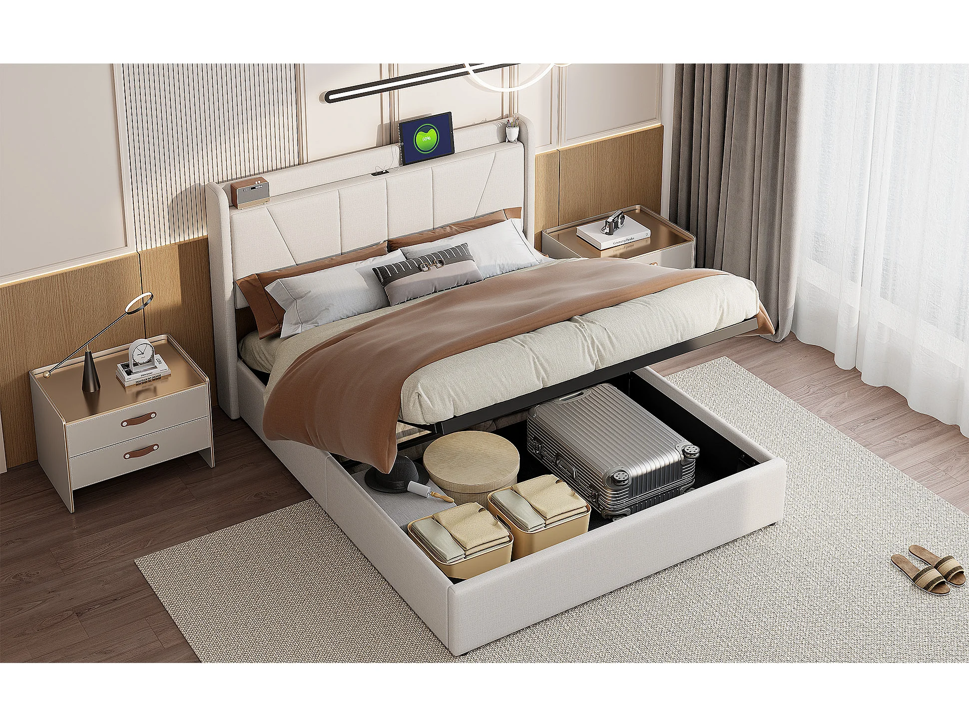Opbergbed van 140x200 cm met Type-C- en USB-poort, gestoffeerd tweepersoonsbed met lattenbodem, hydraulisch gestoffeerd bed met opbergruimte, linnen, beige