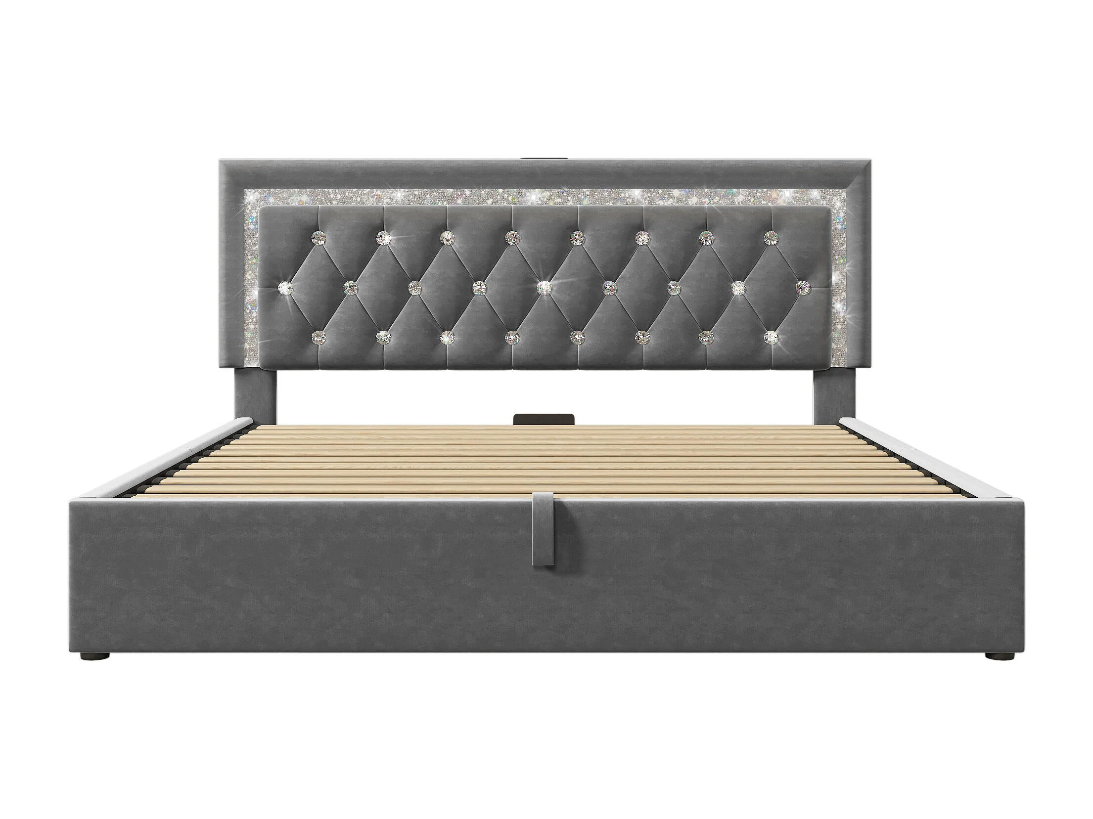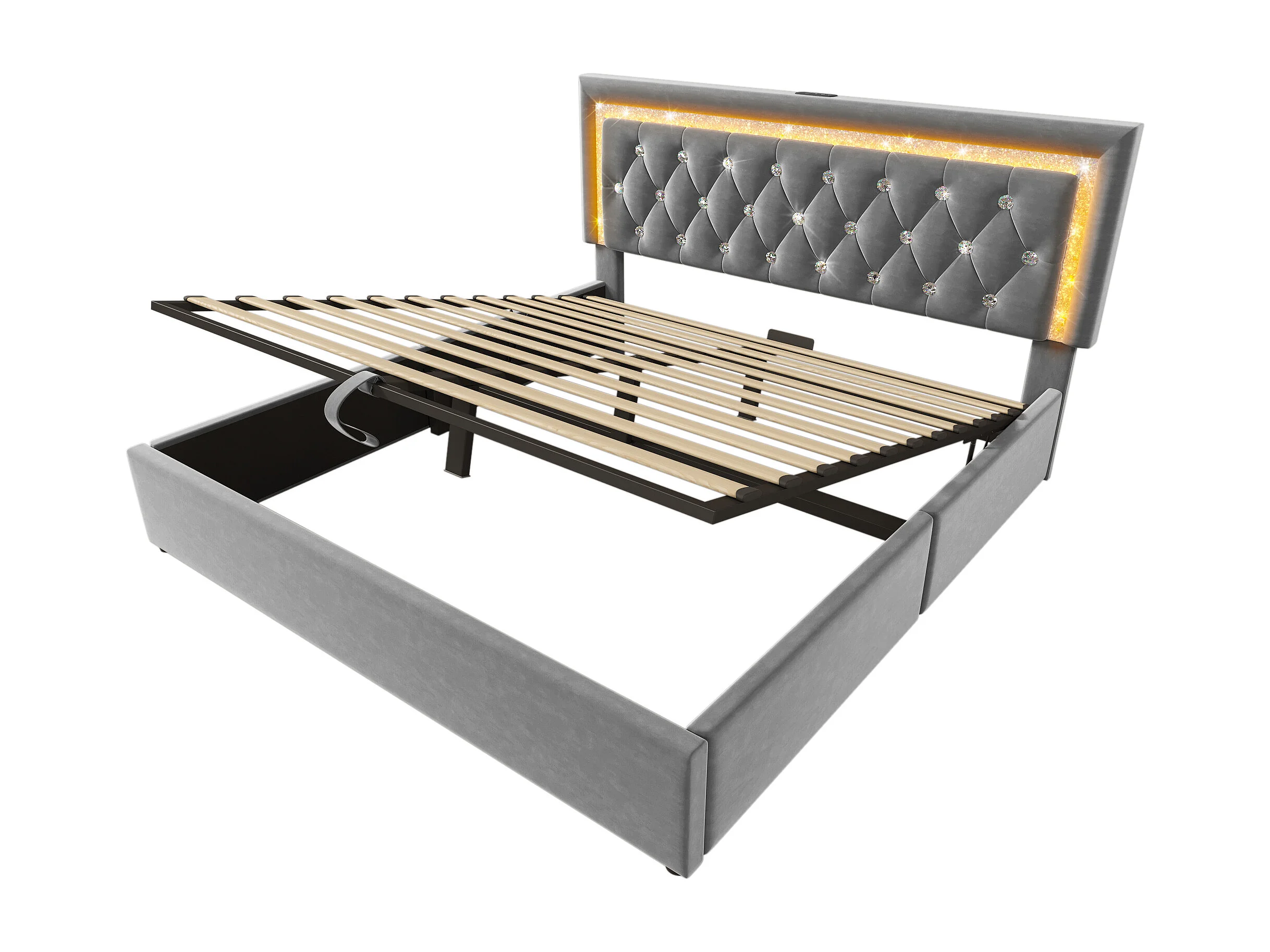 Opbergbed van 160x200 cm in grijs fluweel - Volwassenenbed met ledverlichting, USB- en Type-C-aansluiting (matras niet inbegrepen)