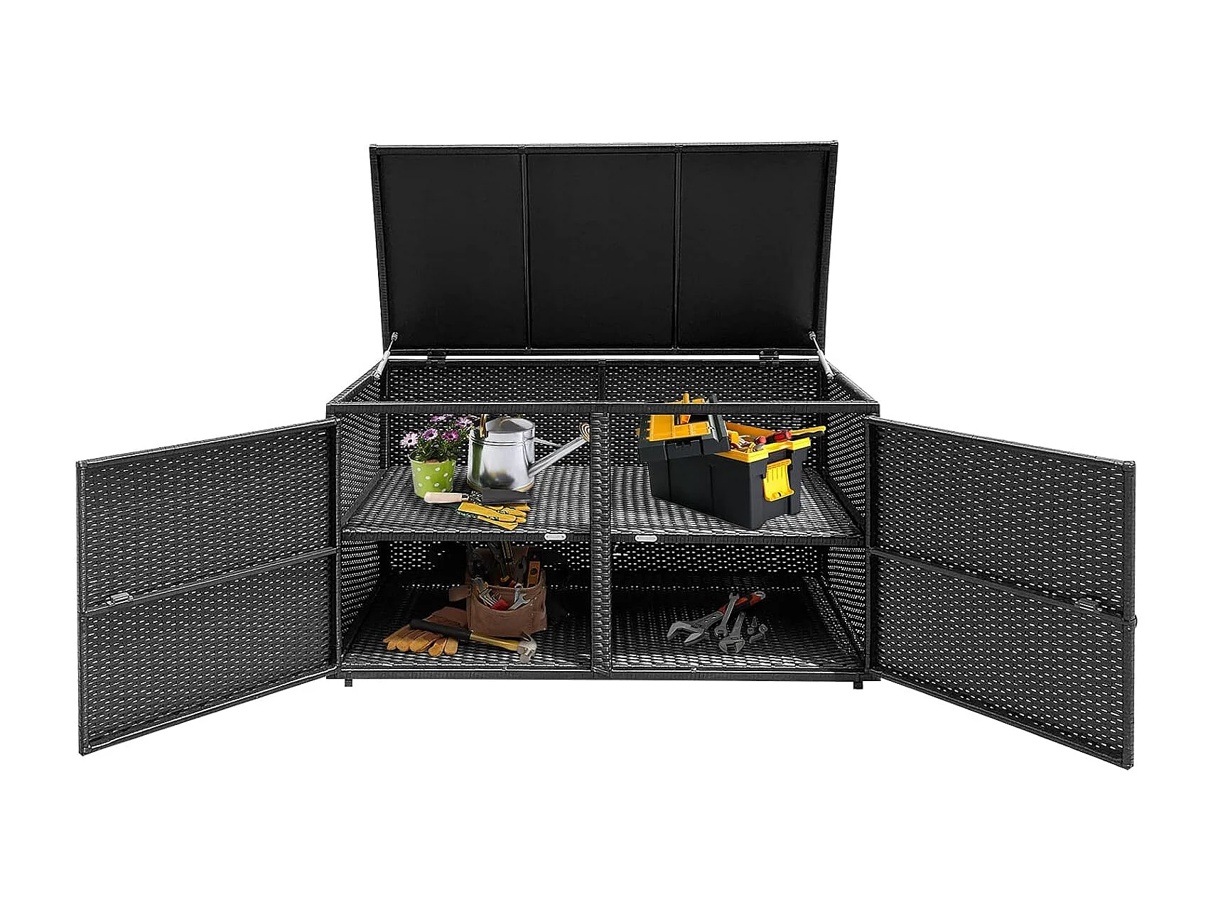Opbergbox rotan, 333 liter, kussenbox met dubbele deuren, deksel en plank, kistbank, tuinbox, weerbestendig,tuin en balkon, 115/215 x 60 x 65 cm (zwart)TI93228