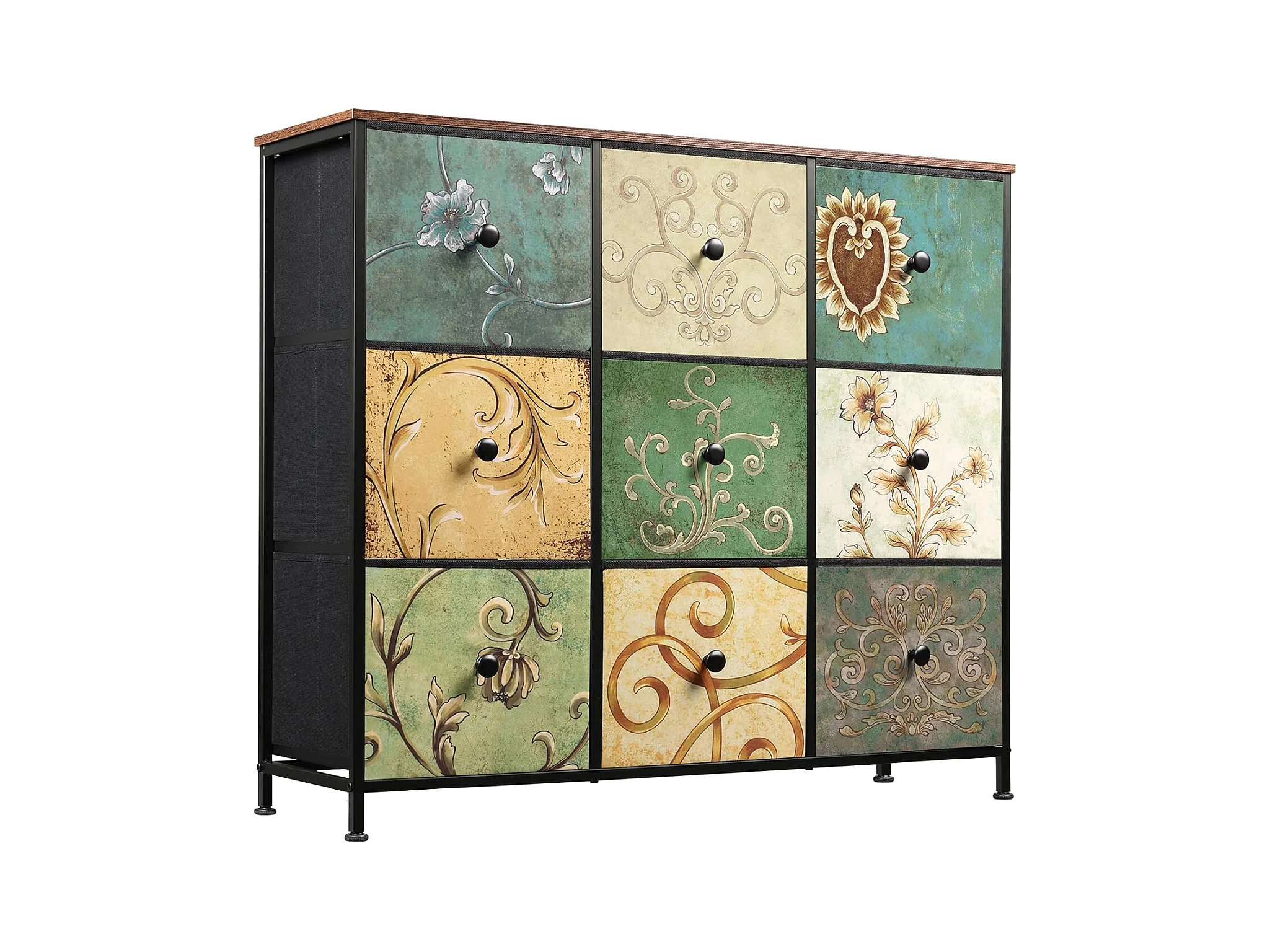 100 cm opbergladekast - met 9 opbergladen en zwarte handgrepen, Vintage patroon - Groen