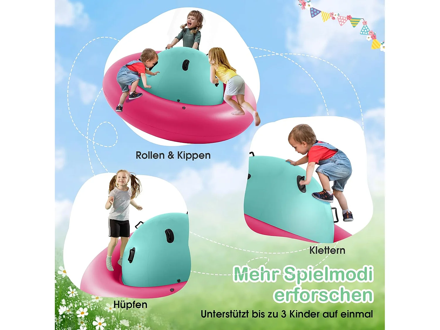 Opblaasbare koepelwip voor kinderen,223 cm grote kinderwip om te rollen,met 6 geïntegreerde handgrepen, outdoorwip voor kinderen vanaf 5 jaar (roze + groen)ZB32102