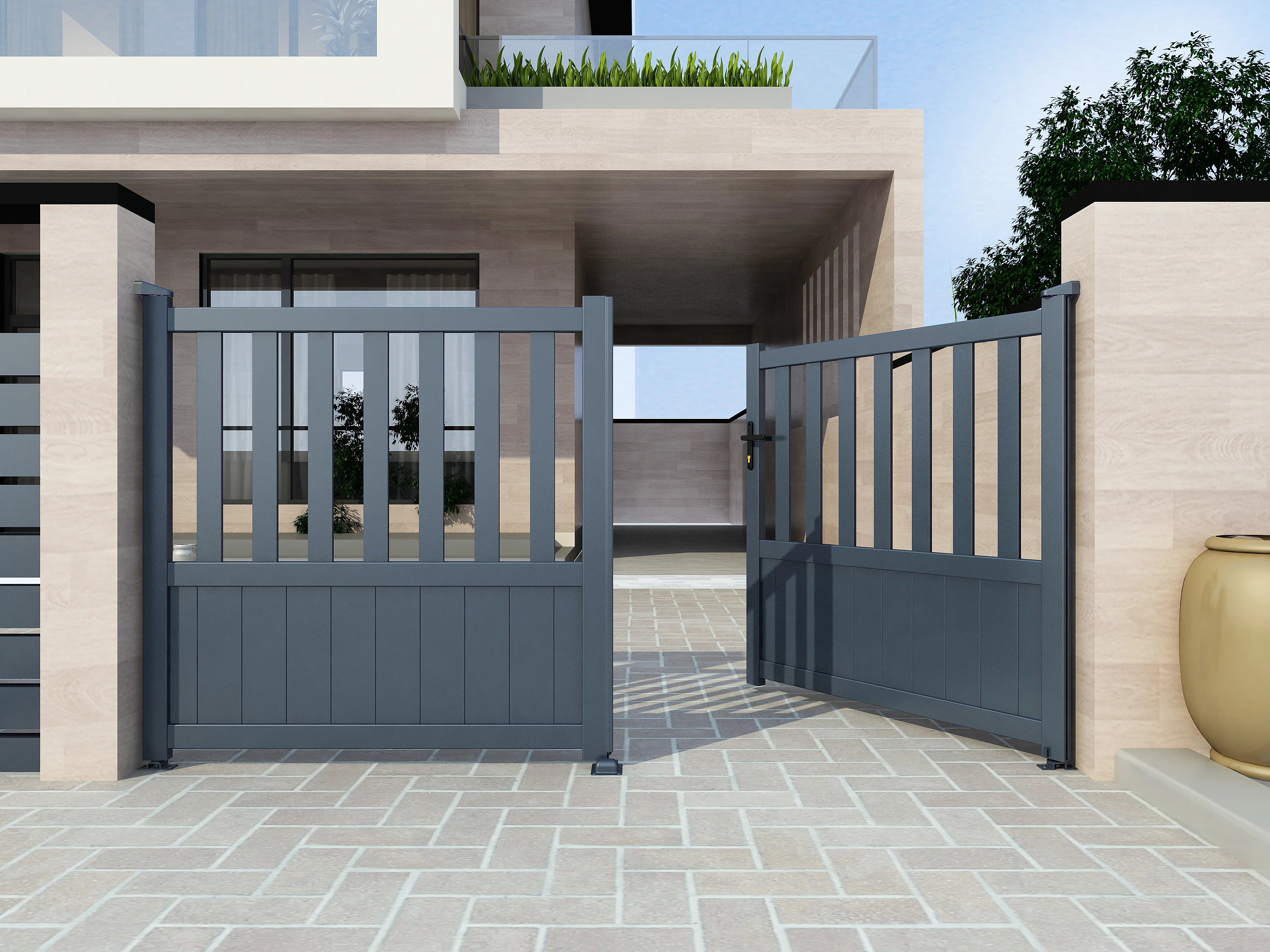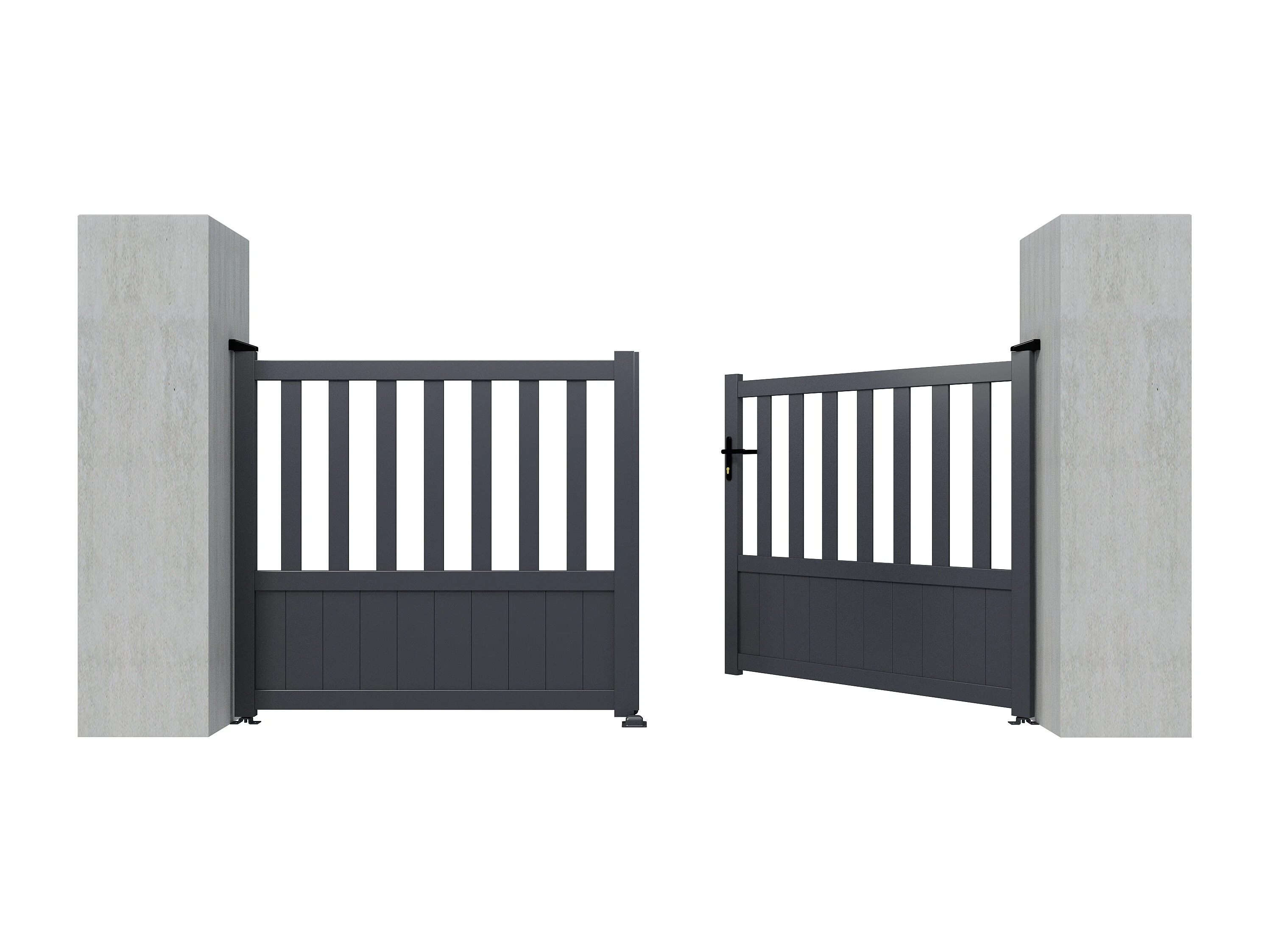 Opengewerkte elektrische draaipoort van aluminium L314 x H140 cm antraciet TARNOS II