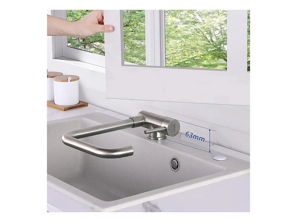 Opklapbare Keukenmengkraan, Opvouwbare Keukenkraan Onder Raam, Keukenkraan met hoge 360° draaibare uitloop en demonteerbare beluchter, geborsteld